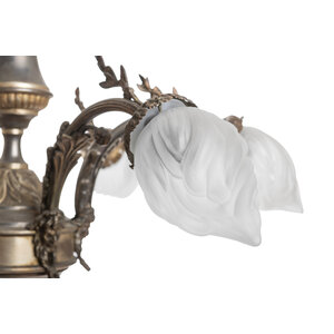 De lamp heeft 6 armen met daaraan matglazen lampenkapjes in de vorm van een vlam.
