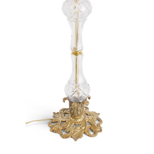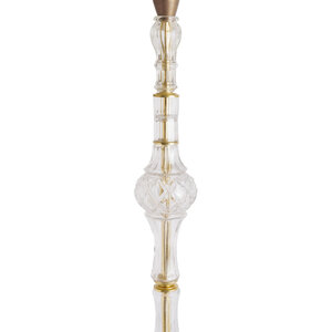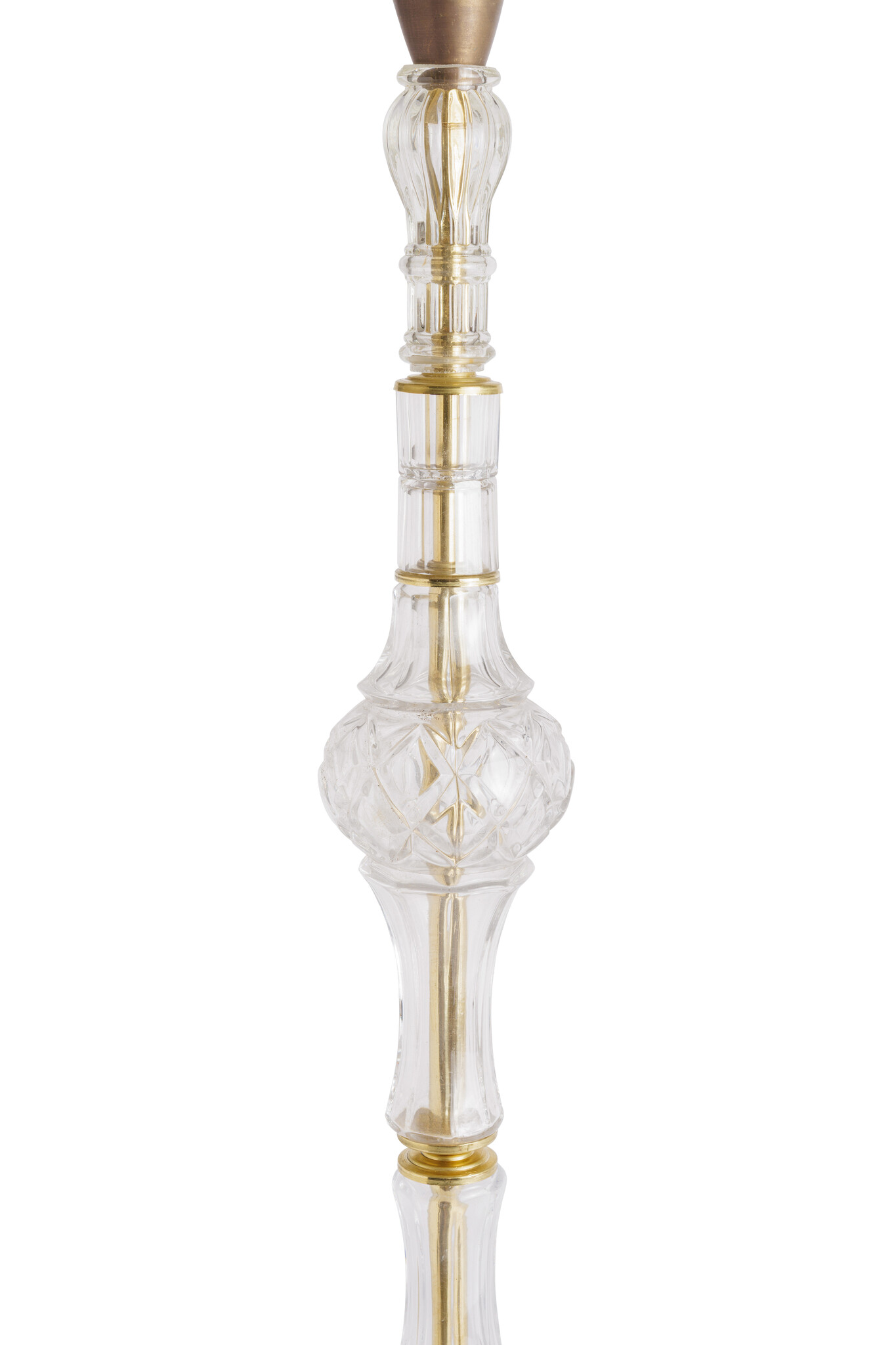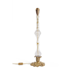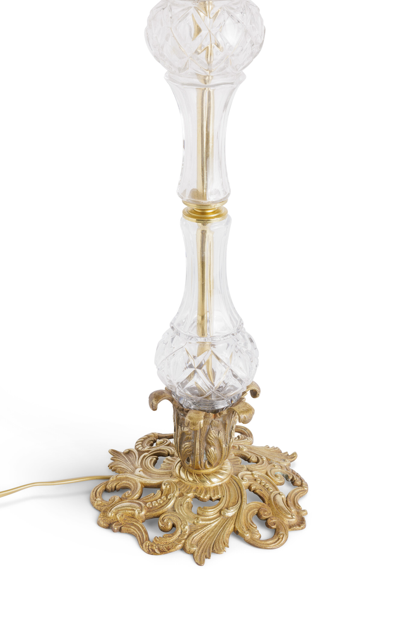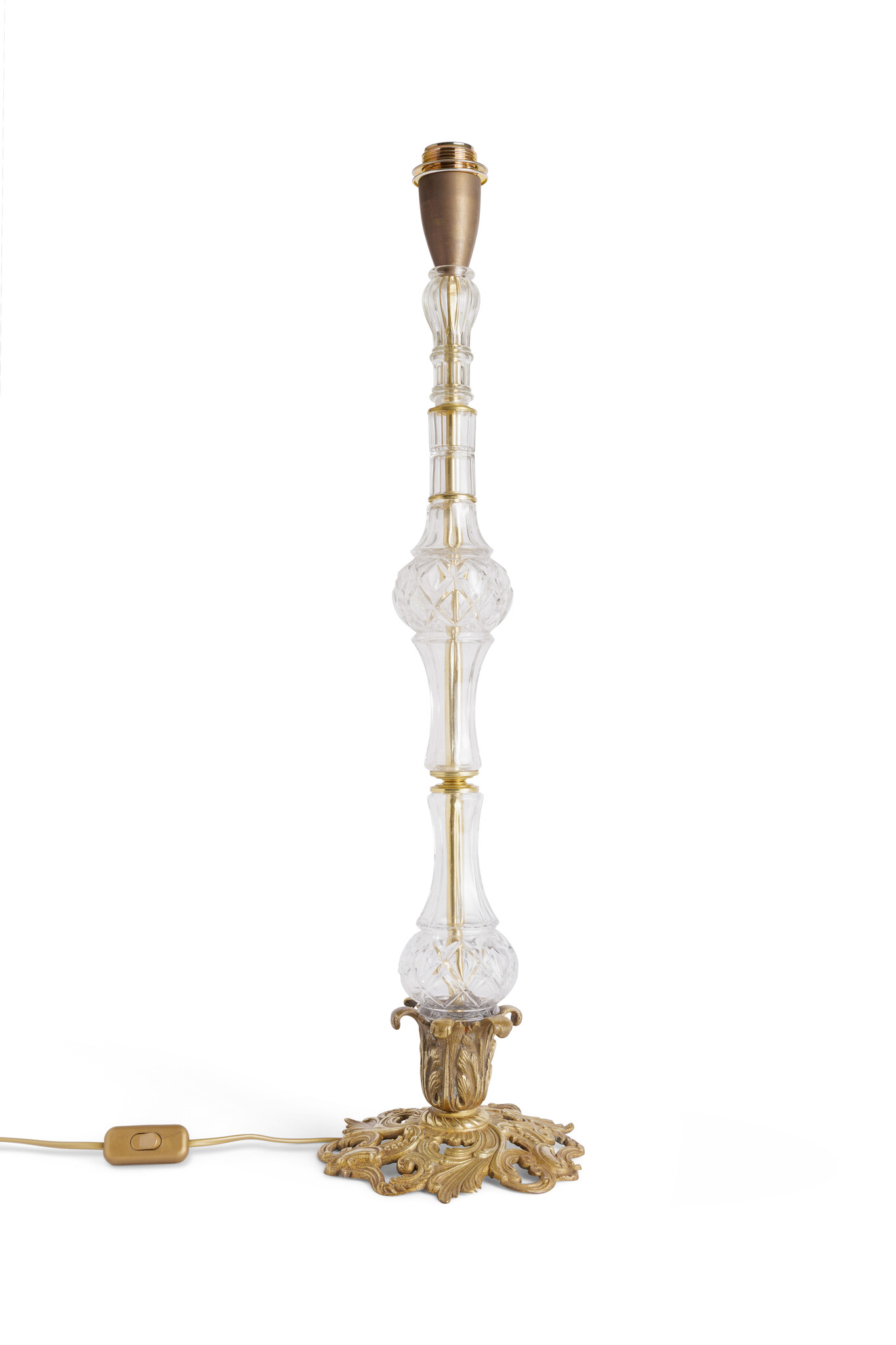 De voet is prachtig vormgegeven als een glazen vaas, rustend op een sierlijke, barokke basis.