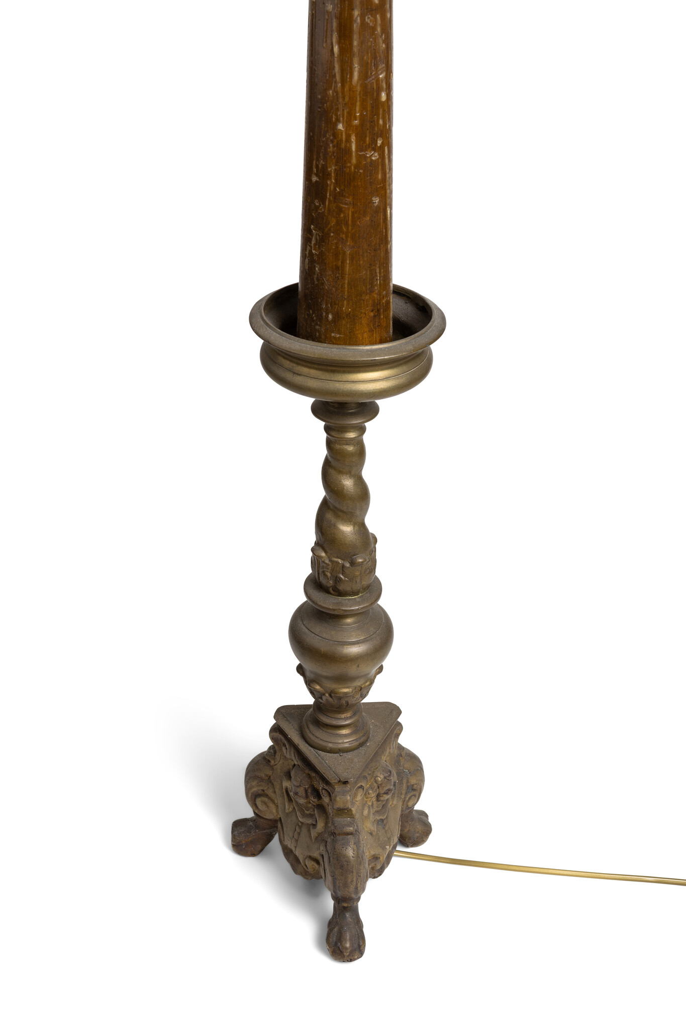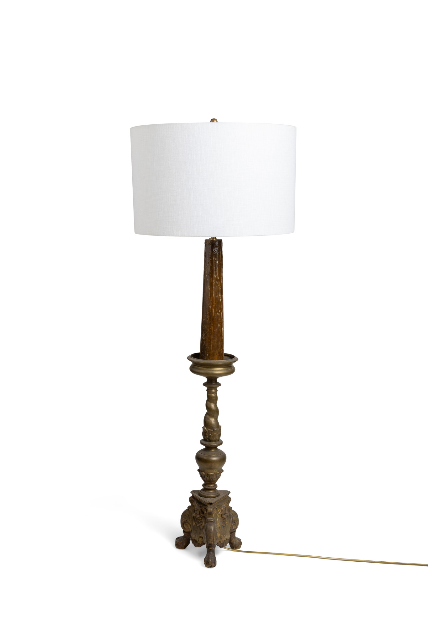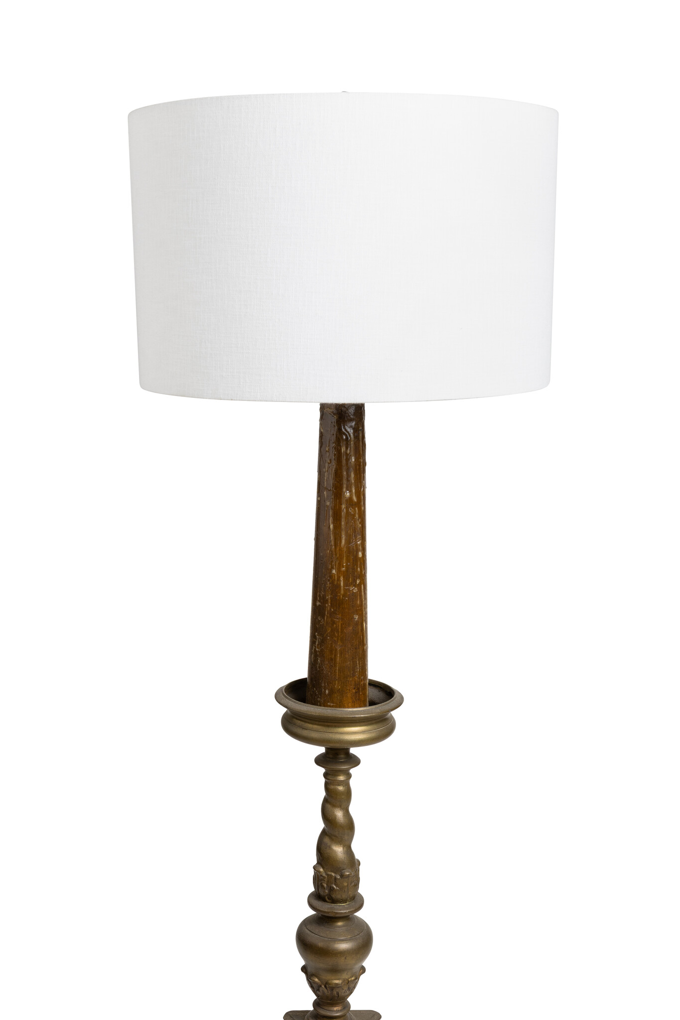 Deze behoorlijk grote vintage vloerlamp van 110 cm hoog, valt direct op met zijn robuuste messing voet en de bijzondere, bruine kaarshuls van karton, zorgvuldig omwikkeld met kaarsvet voor een authentieke, oude look.