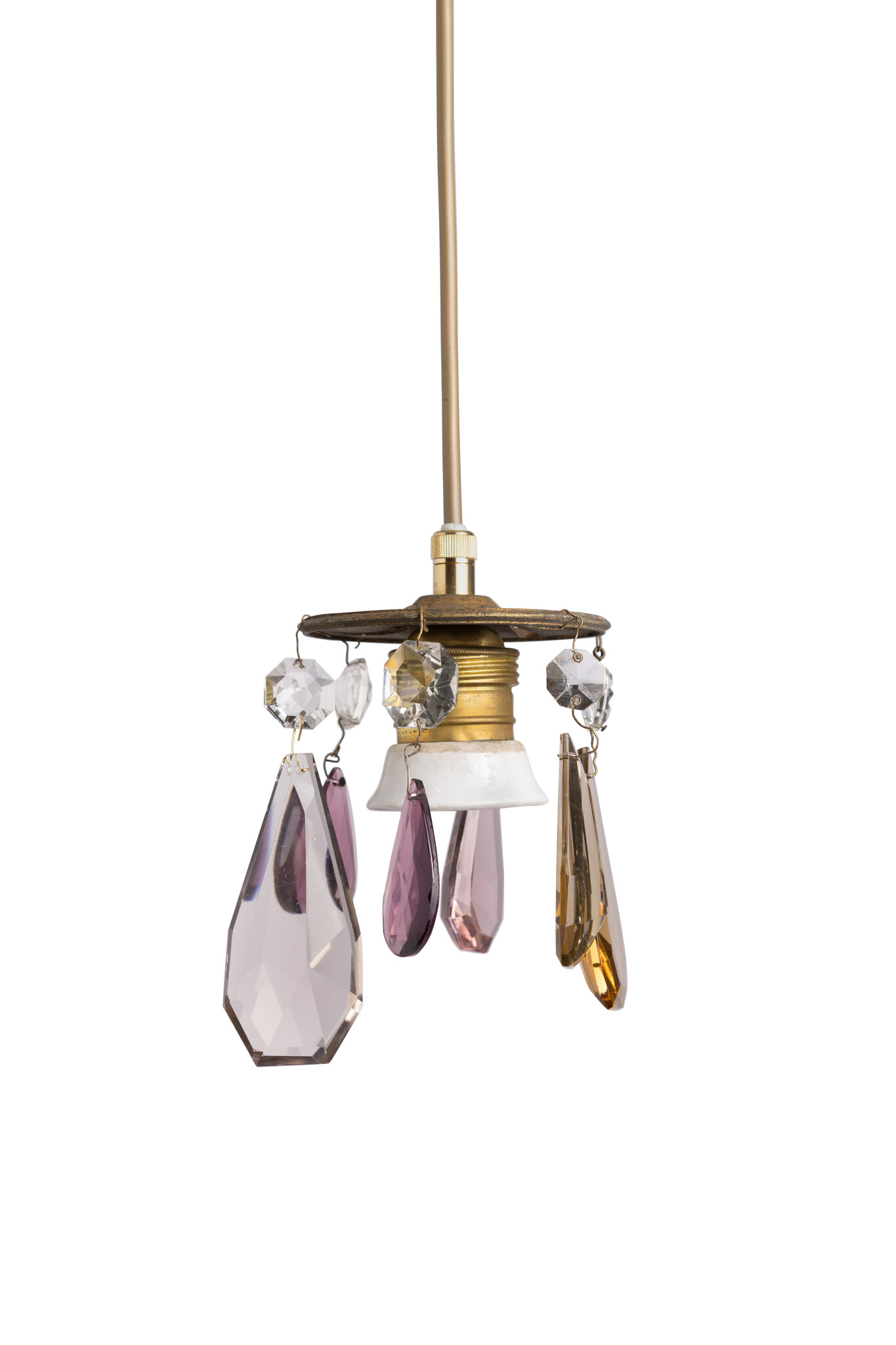 Een goud-bruin messing armatuur met allemaal gekleurde glazen pegels.