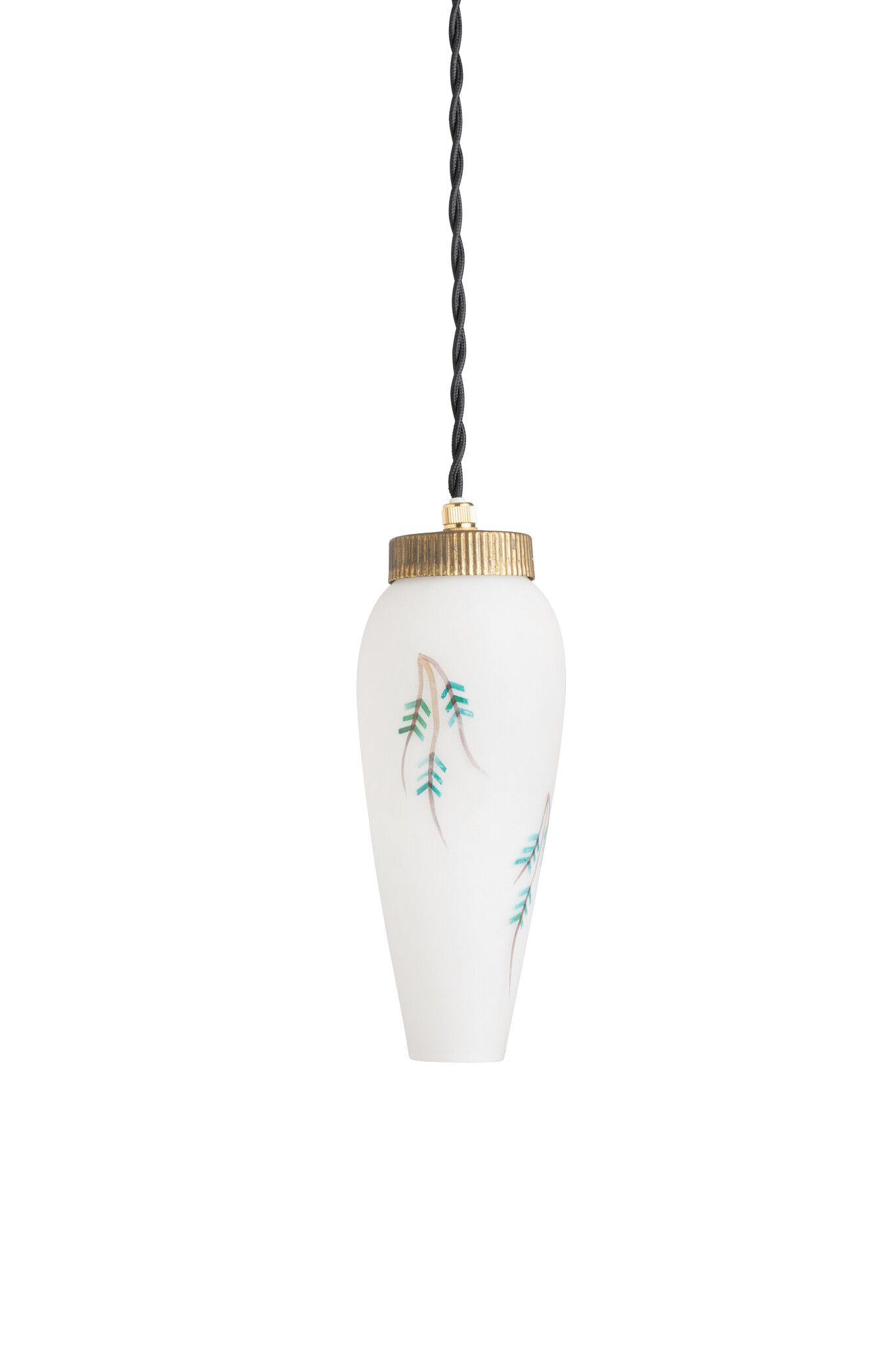 Een wit glazen lampenkapje, cypresvormig, met groene takjes erop.