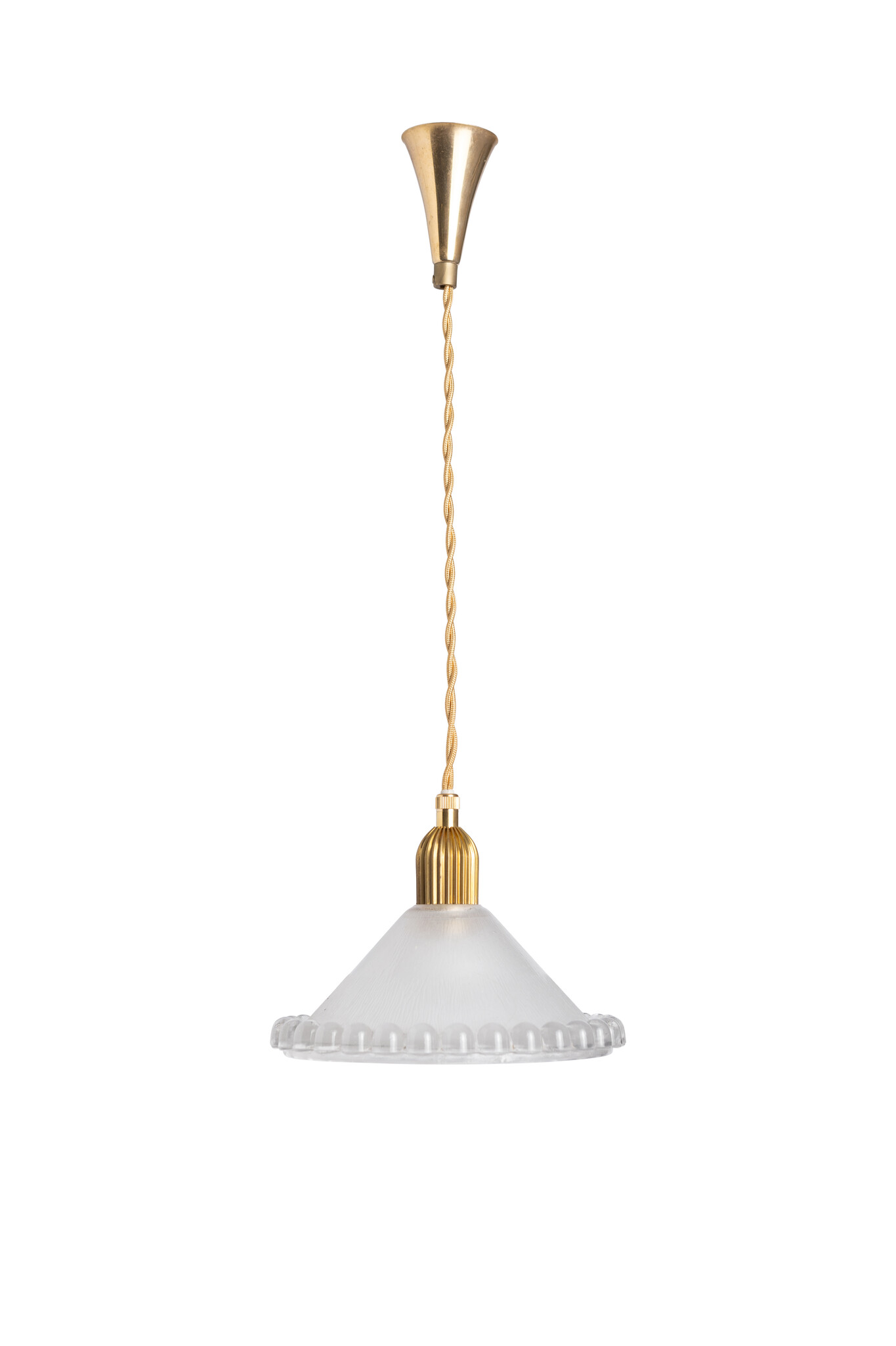 Glazen kapje hangt aan goud gedraaid stoffen snoer.