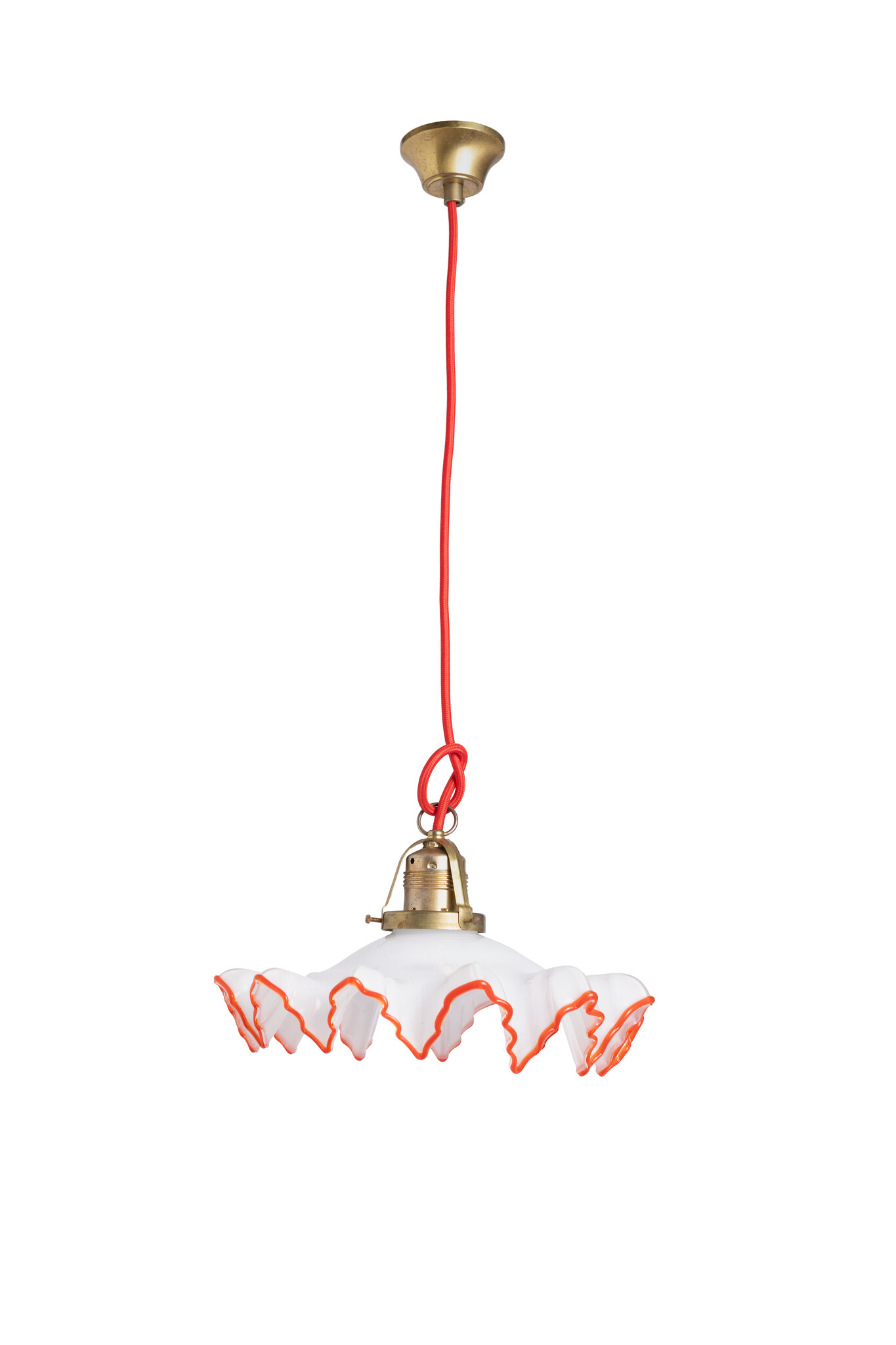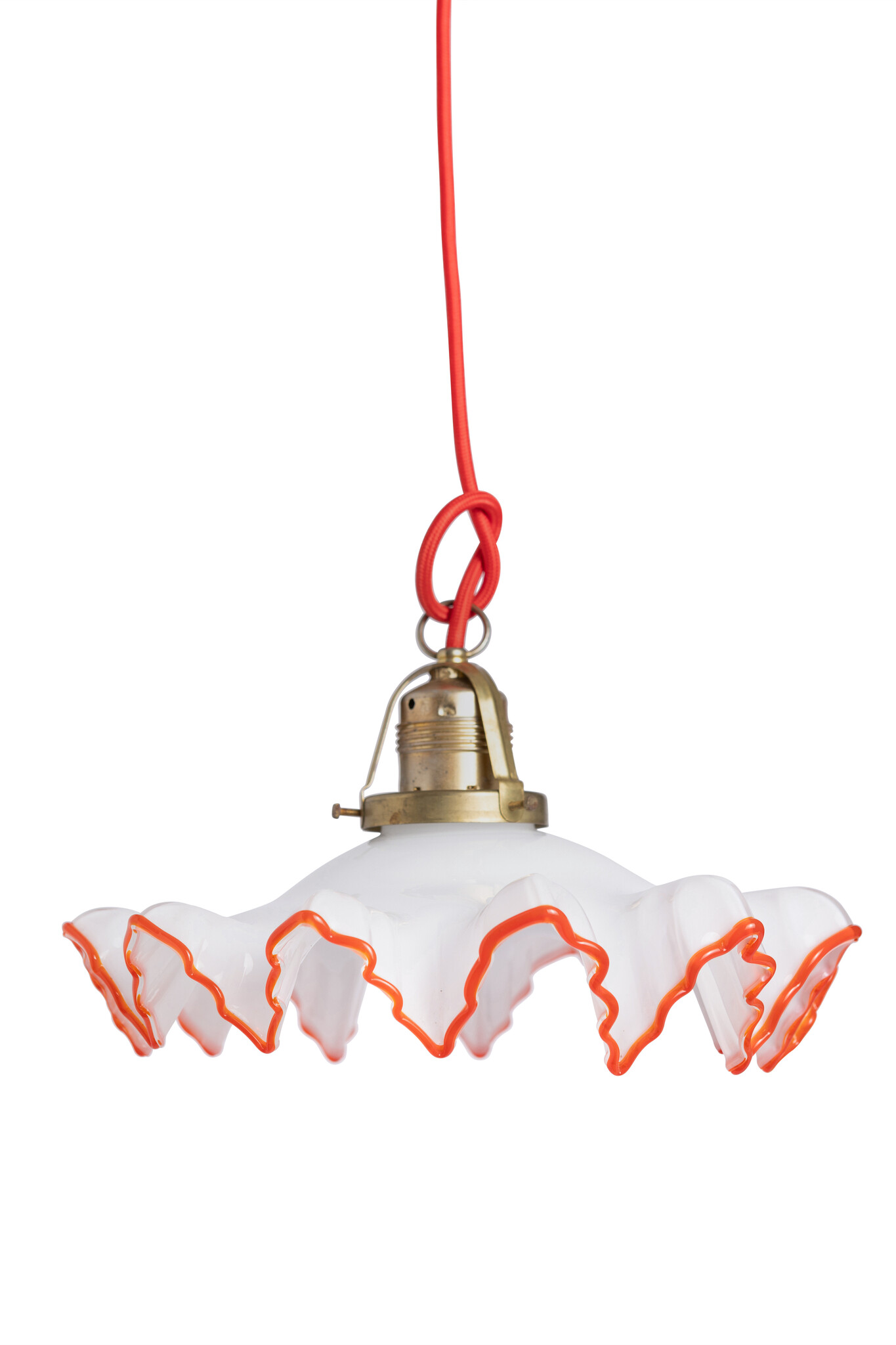 Het lampenkapje hangt aan rood, rond stoffen snoer.