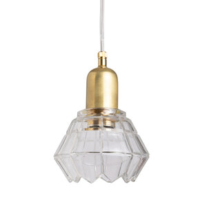 Het glazen kapje hangt aan een mat goudkleurig armatuur en aan doorzichtig snoer.