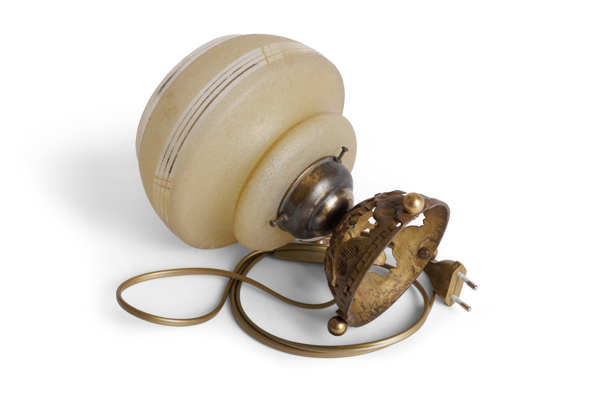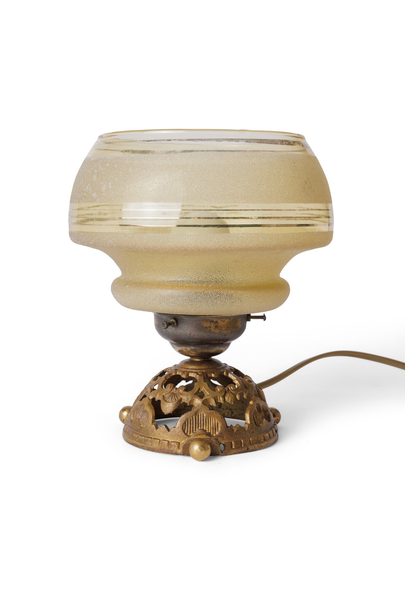 Het heeft een sierlijk voetje van bruin koper met bewerkte details.