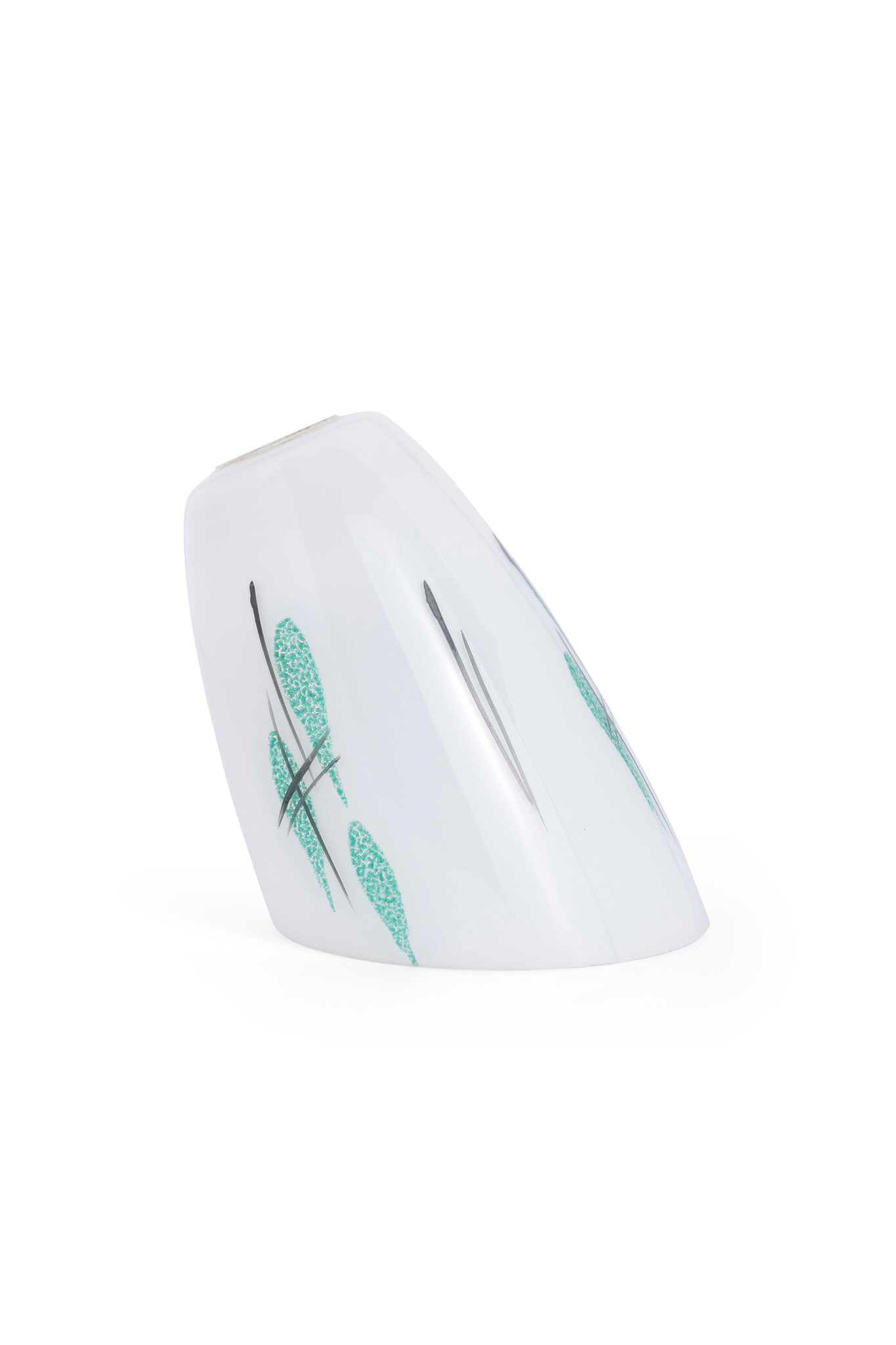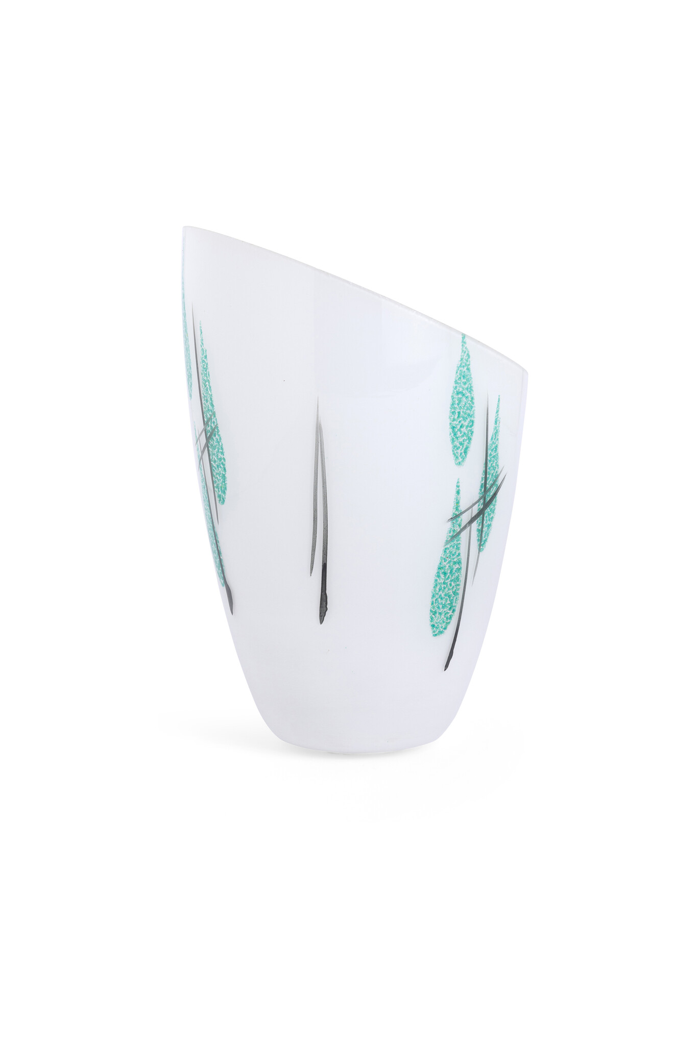 Het glas is wit van kleur en heeft zwart groene decoratie.