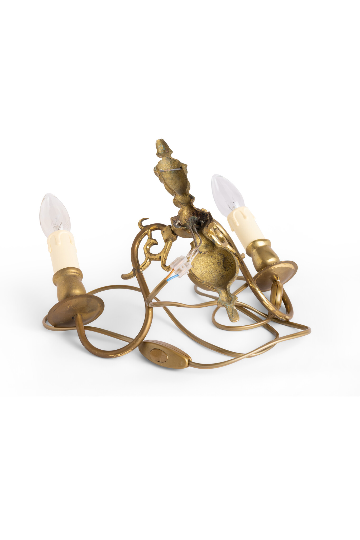 Deze wandlamp heeft twee armen met elektrische kaarsen.