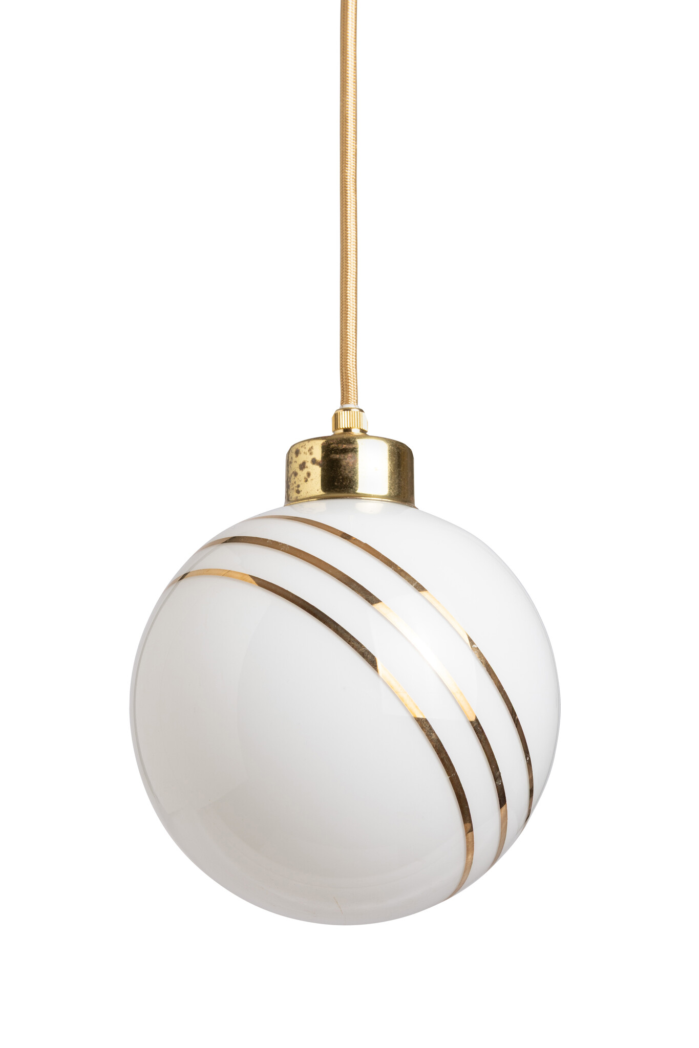 Een wit glazen bolletje met 3 goudkleurige strepen erop.