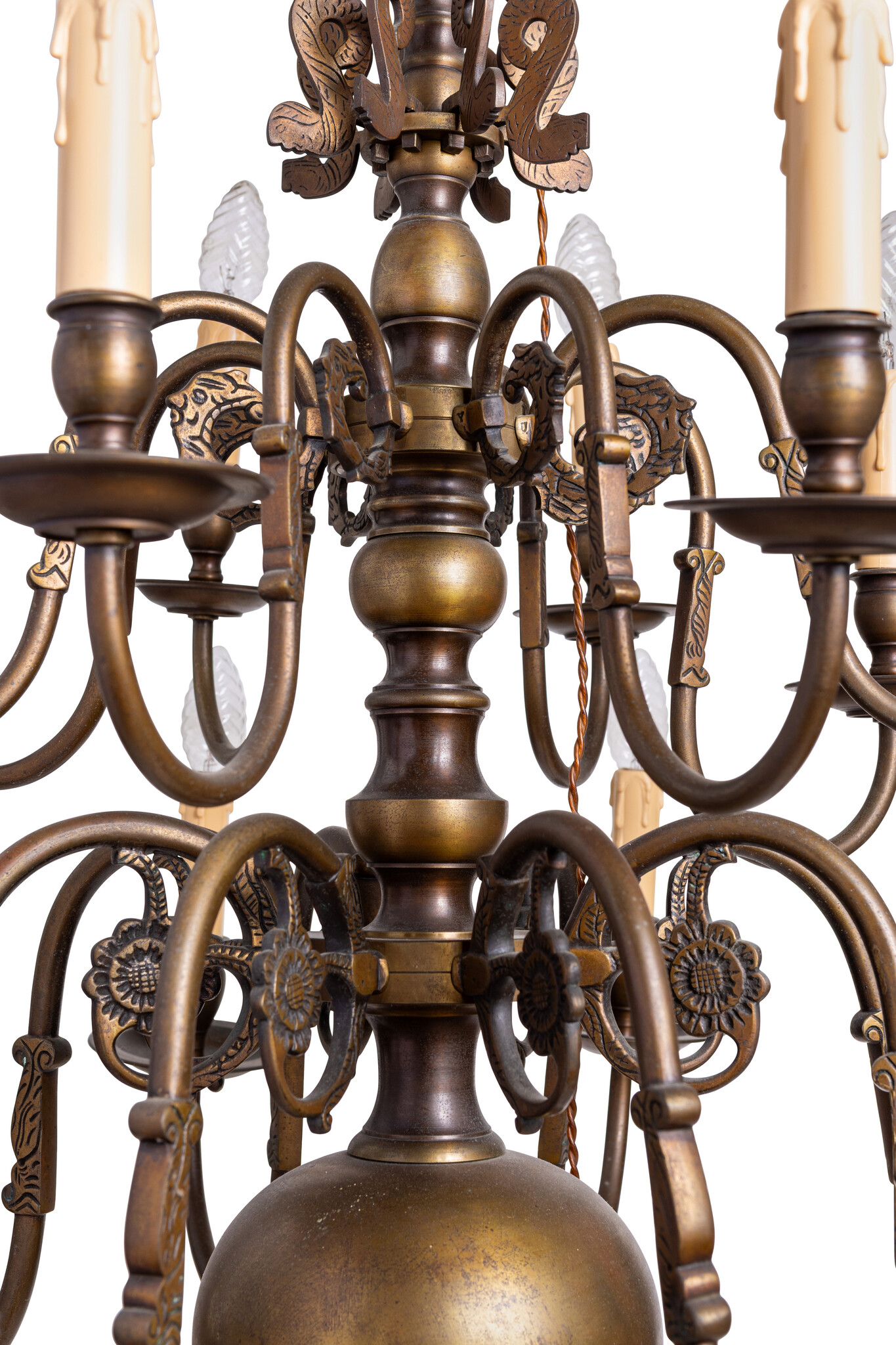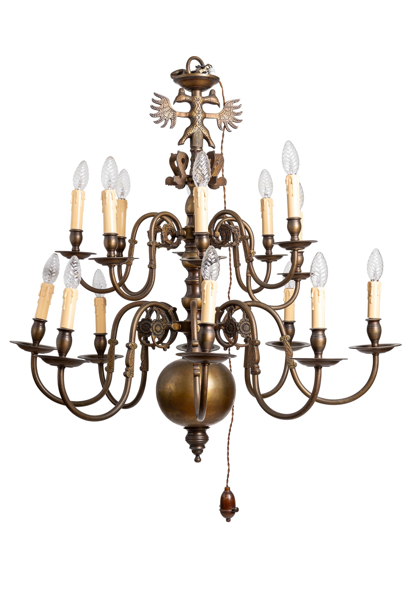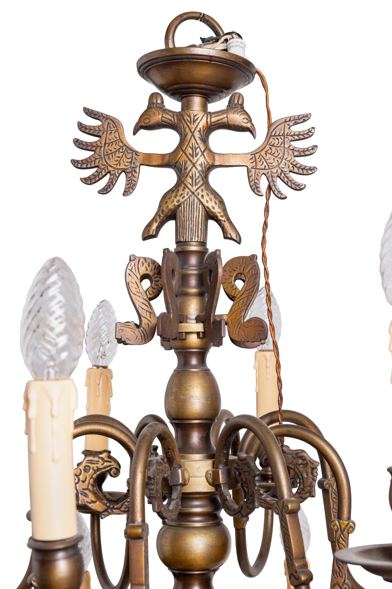 Bovenin een adelaar, daaronder een ring met salamanders (die je erin en eruit kunt haken; vroeger was er echt aandacht voor hoe dingen gemaakt werden, dat kun je ook bij deze lamp echt zien).