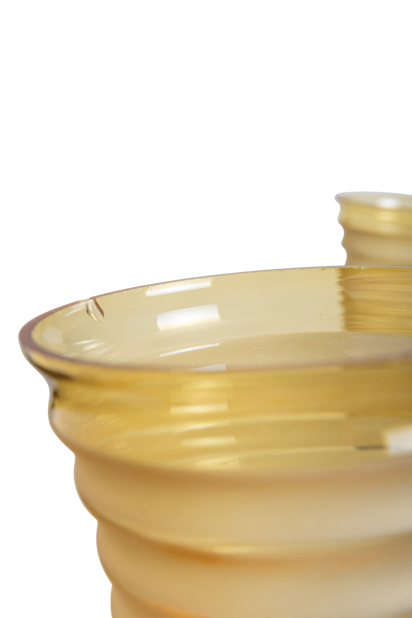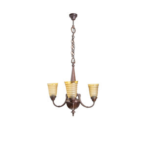 Aan de armen licht okerkleurige glazen lampenkapjes.