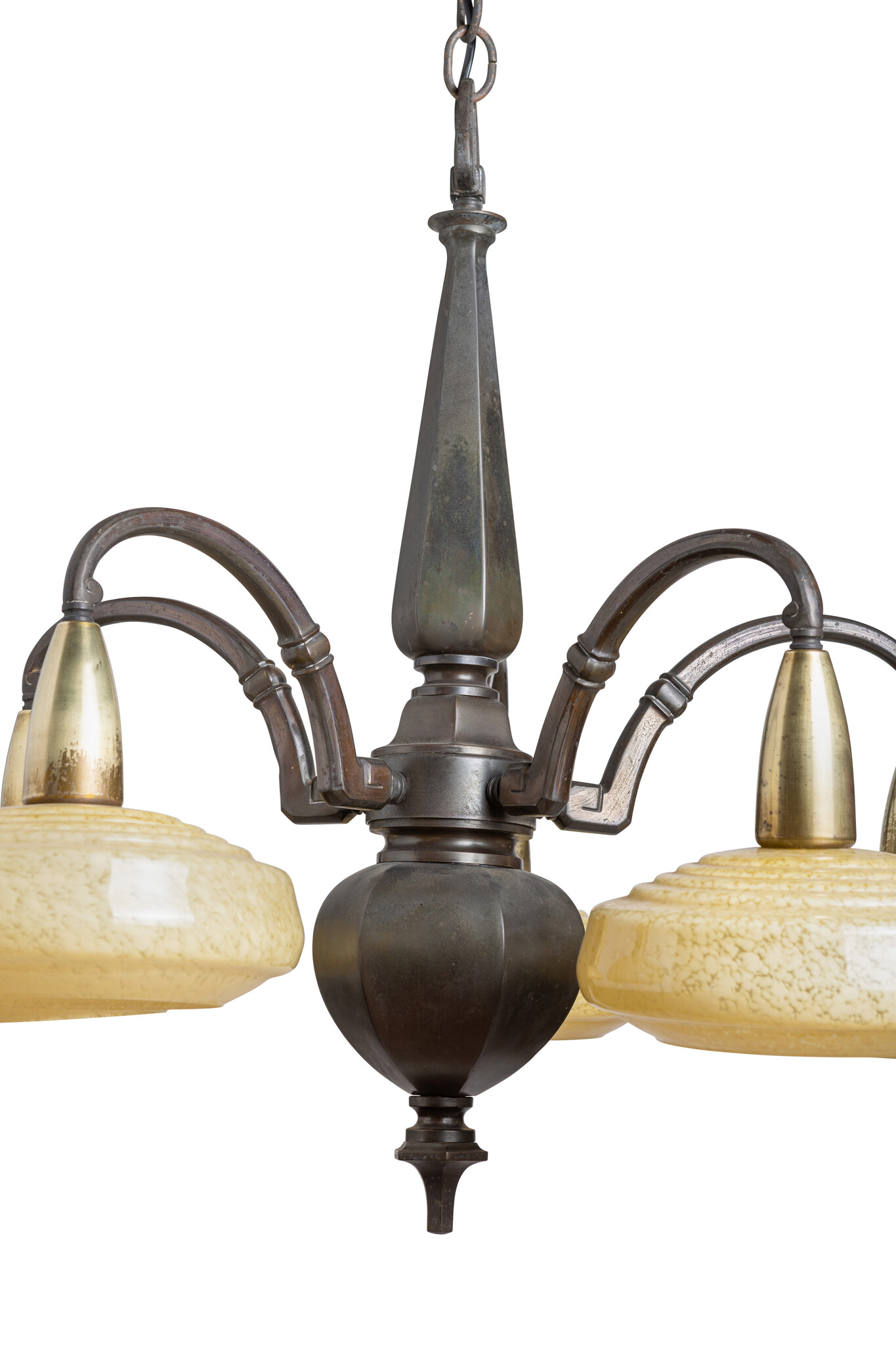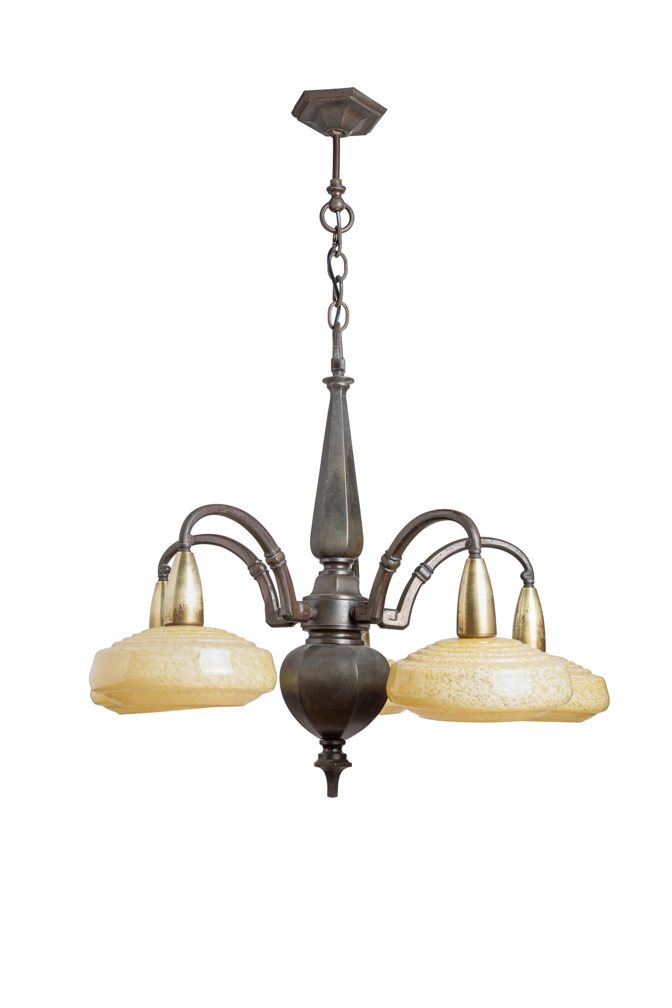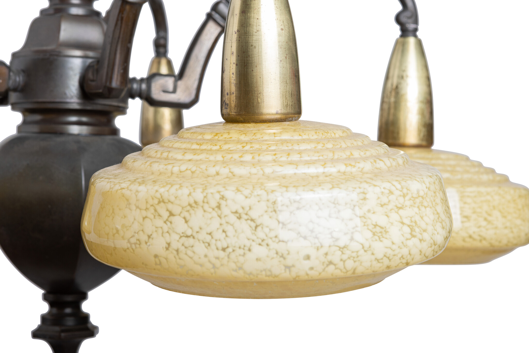 Aan de armen hangen licht geel gewolkte glazen lampenkapjes.