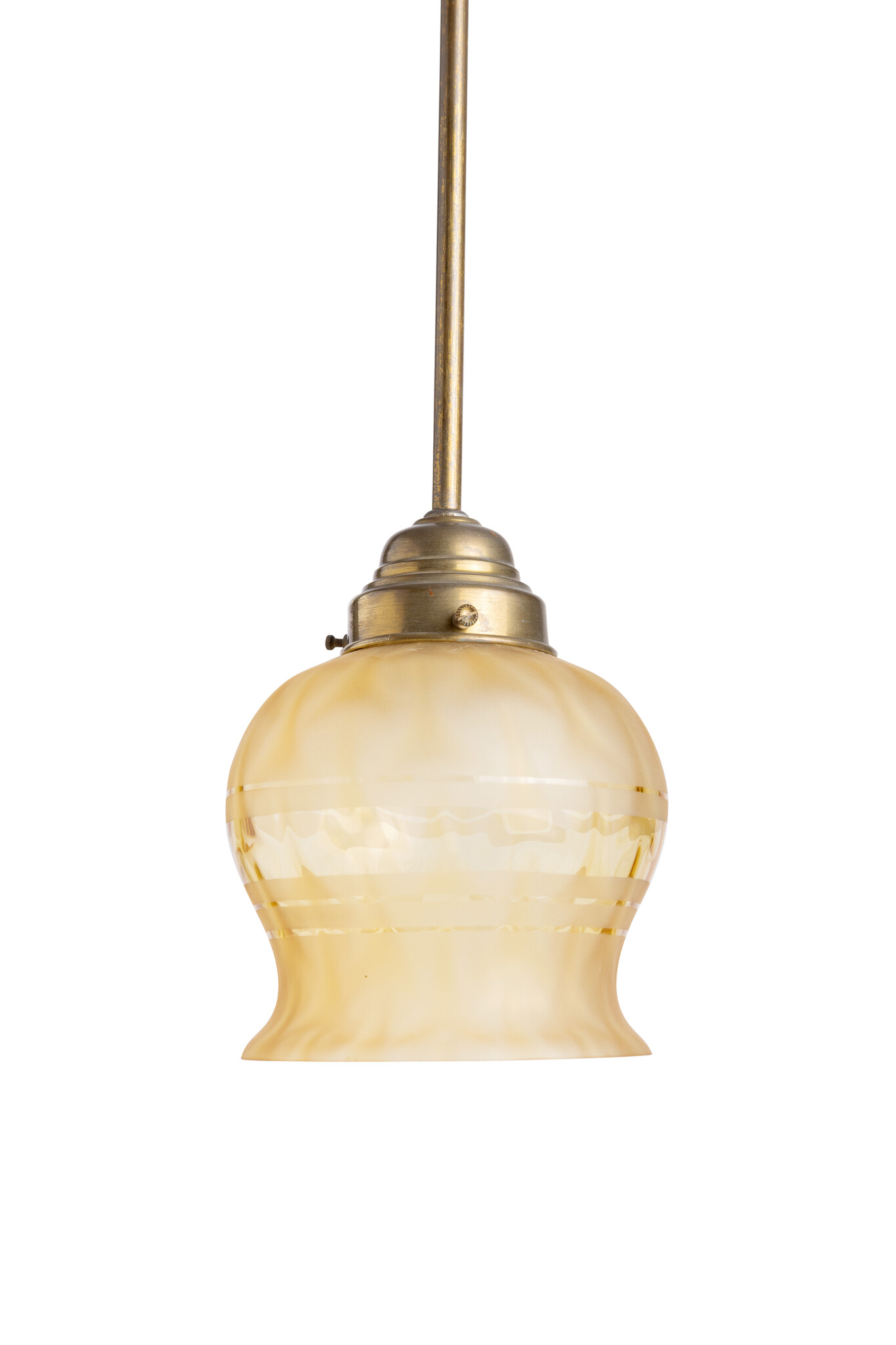 Een goud-bruin messing armatuur en een oker kleurige glazen lampenkap.