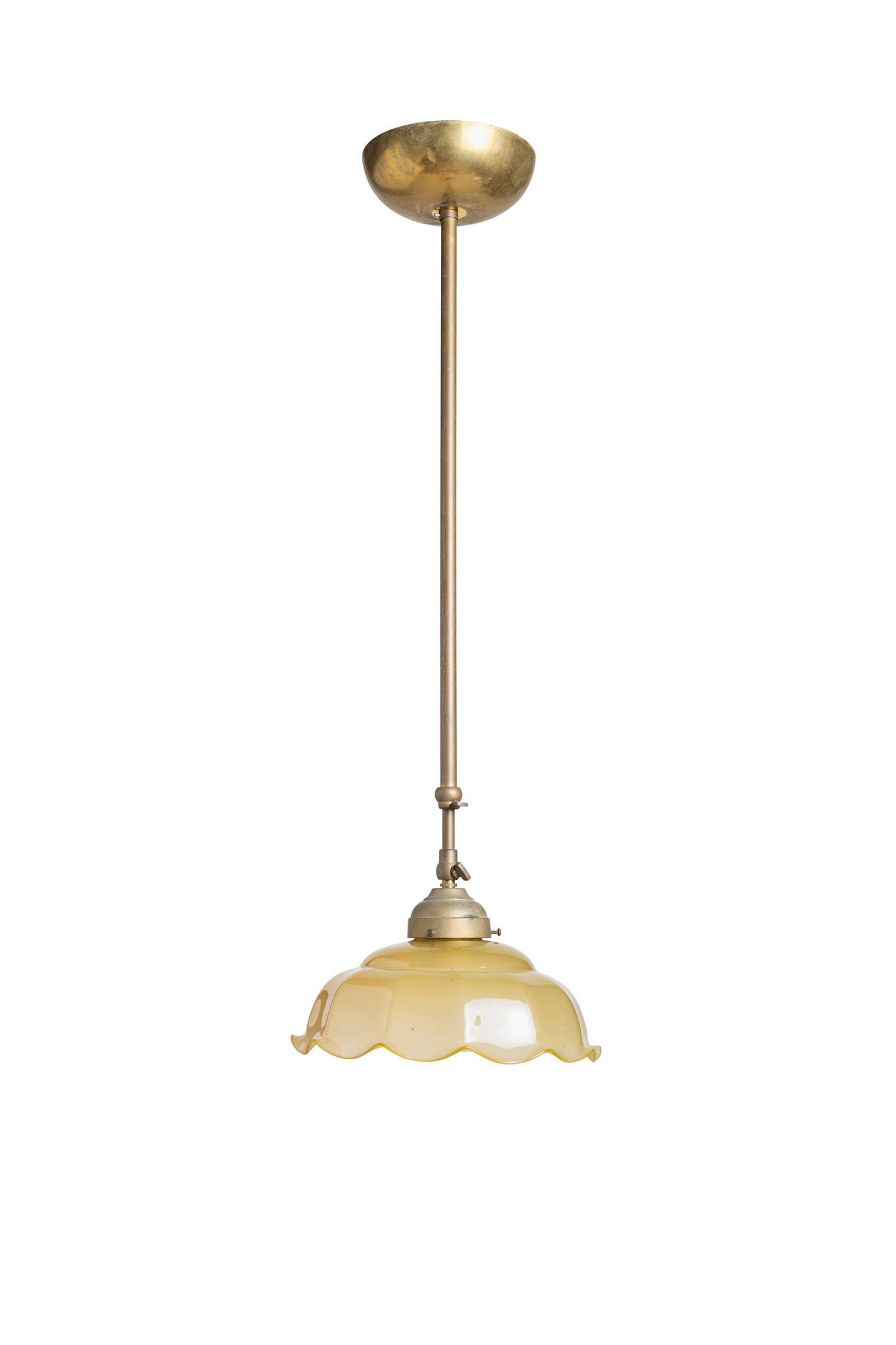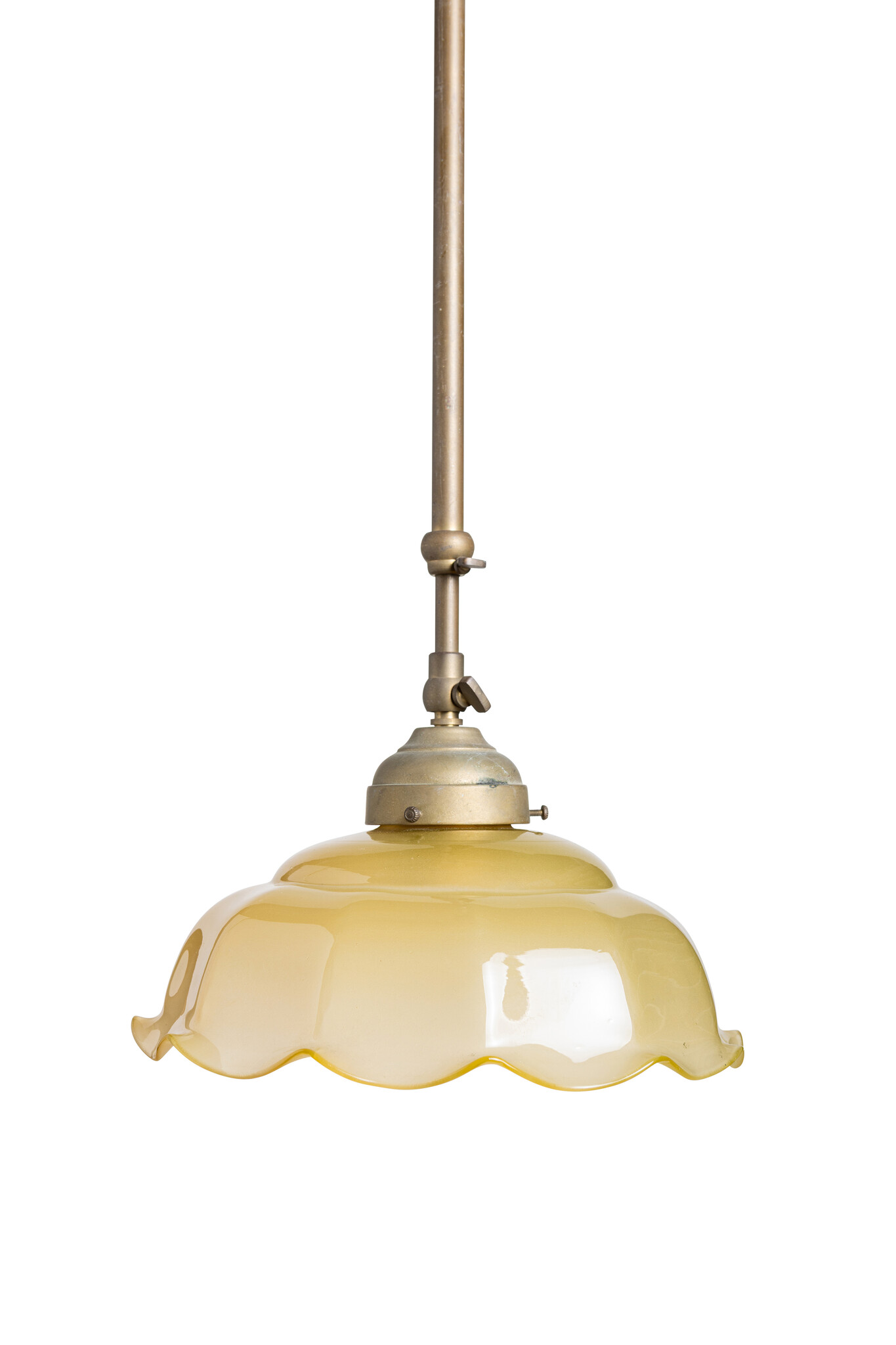 Oude hanglamp, een okerkleurige glazen lampenkap aan goud-bruine messing stang.