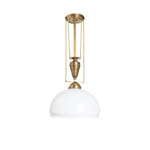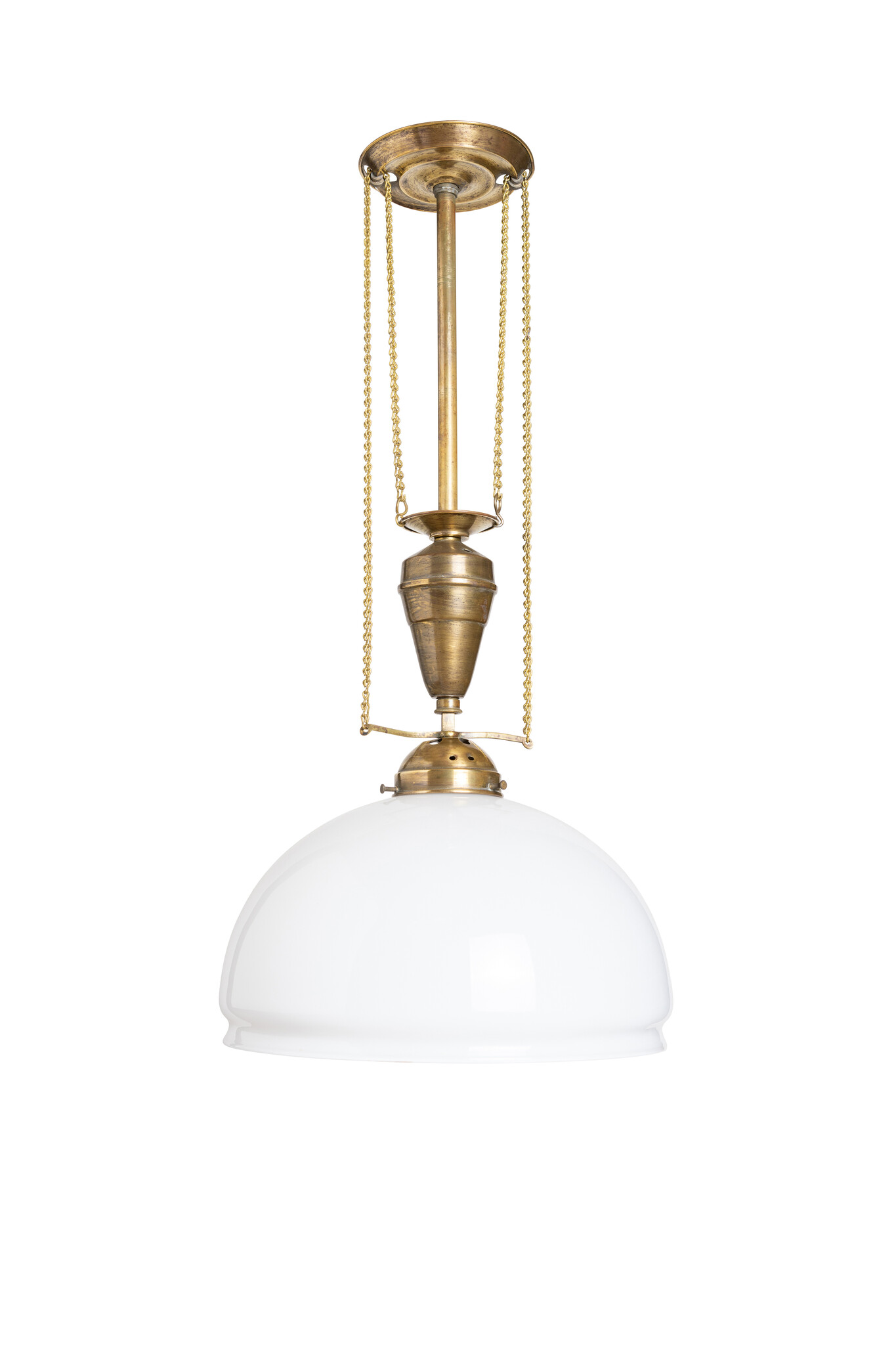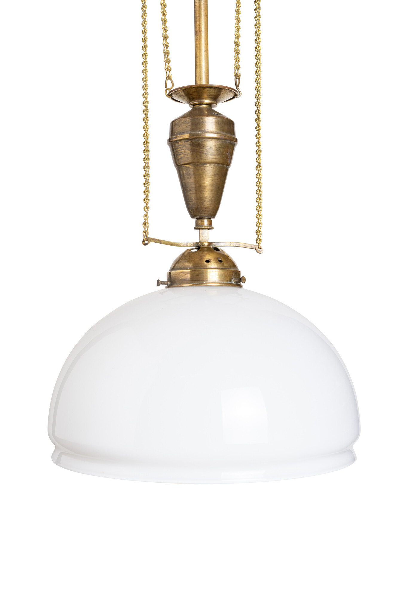 Een verstelbaar messing armatuur en een strakke witte glazen lampenkap.