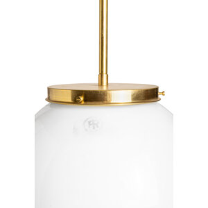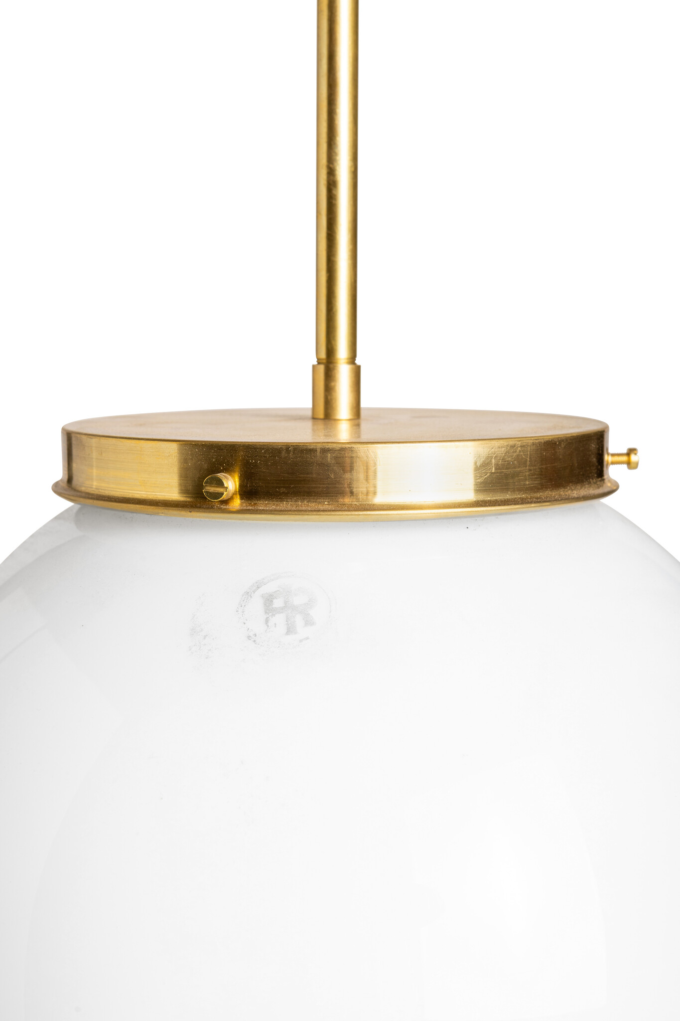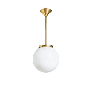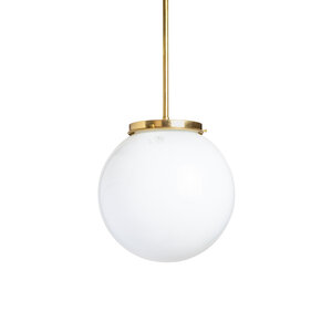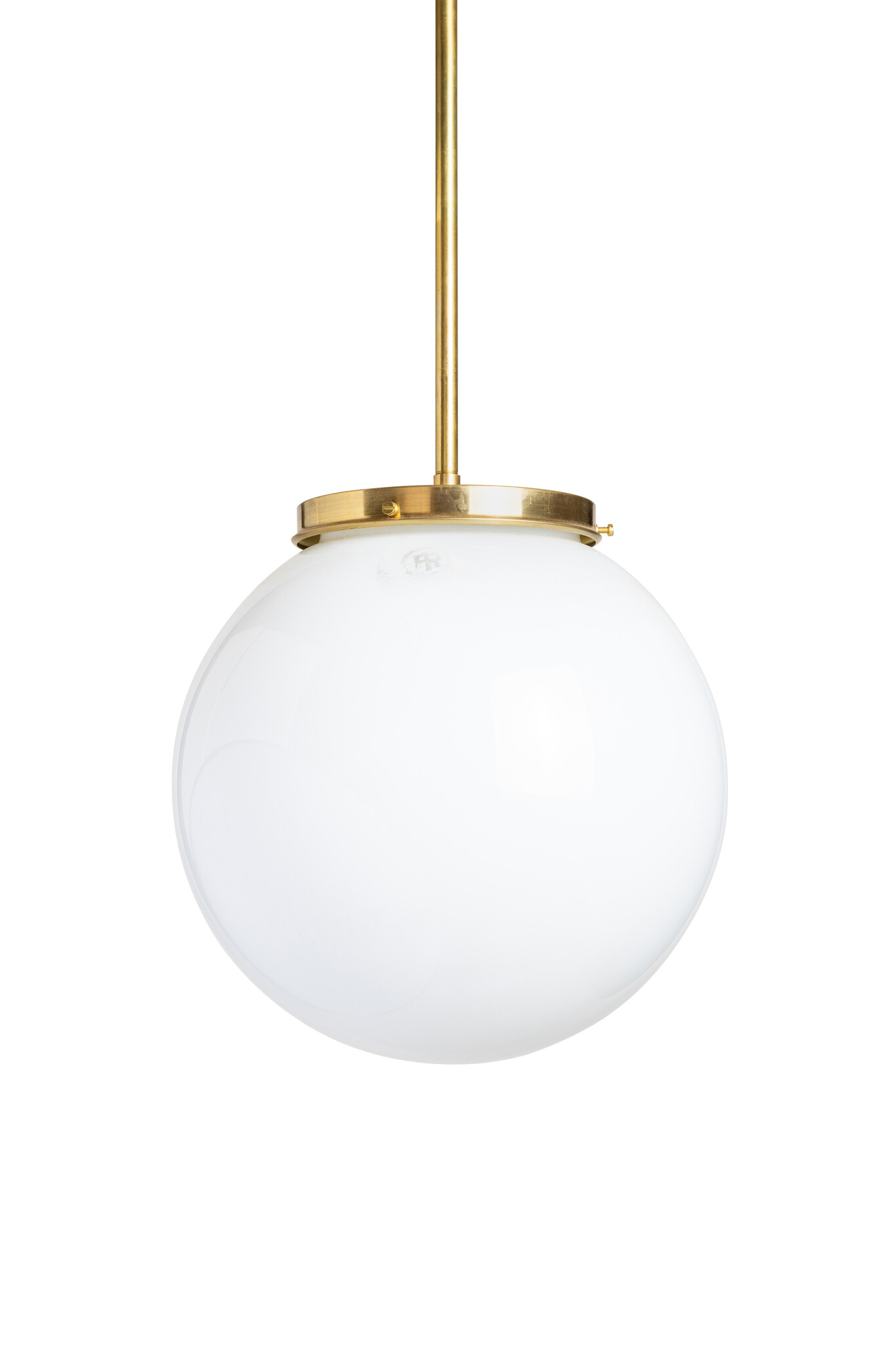 Een vrij grote witte glazen bol aan een messing armatuur.
