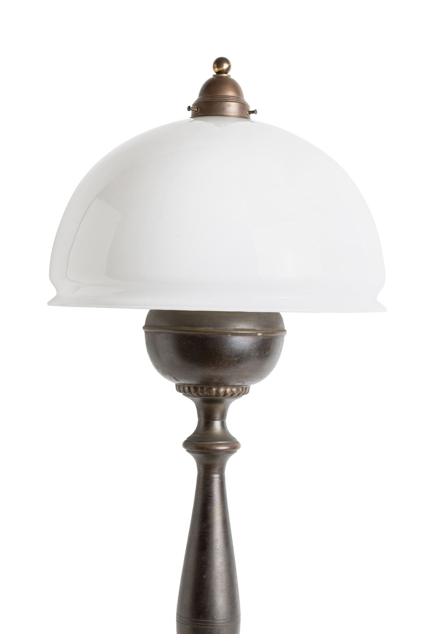 Deze (flink grote) klassieke tafellamp uit de jaren 40 heeft een bruin messing voet met sierlijke bollingen, en een witte, halfronde lampenkap die het licht zacht en warm verspreidt.