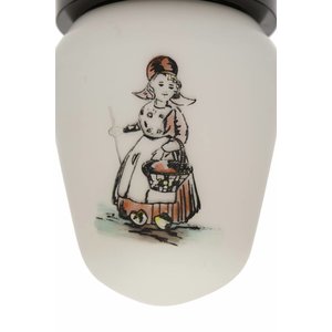 Een oude plafondlamp met daarop afbeeldingen van een boer met een pijp en op de andere zijde een boerin met een mandje.