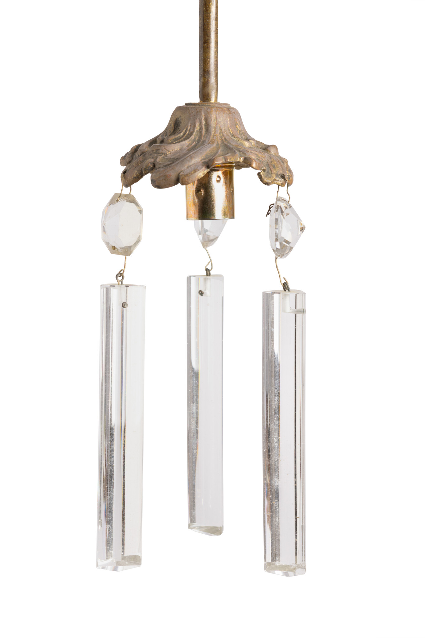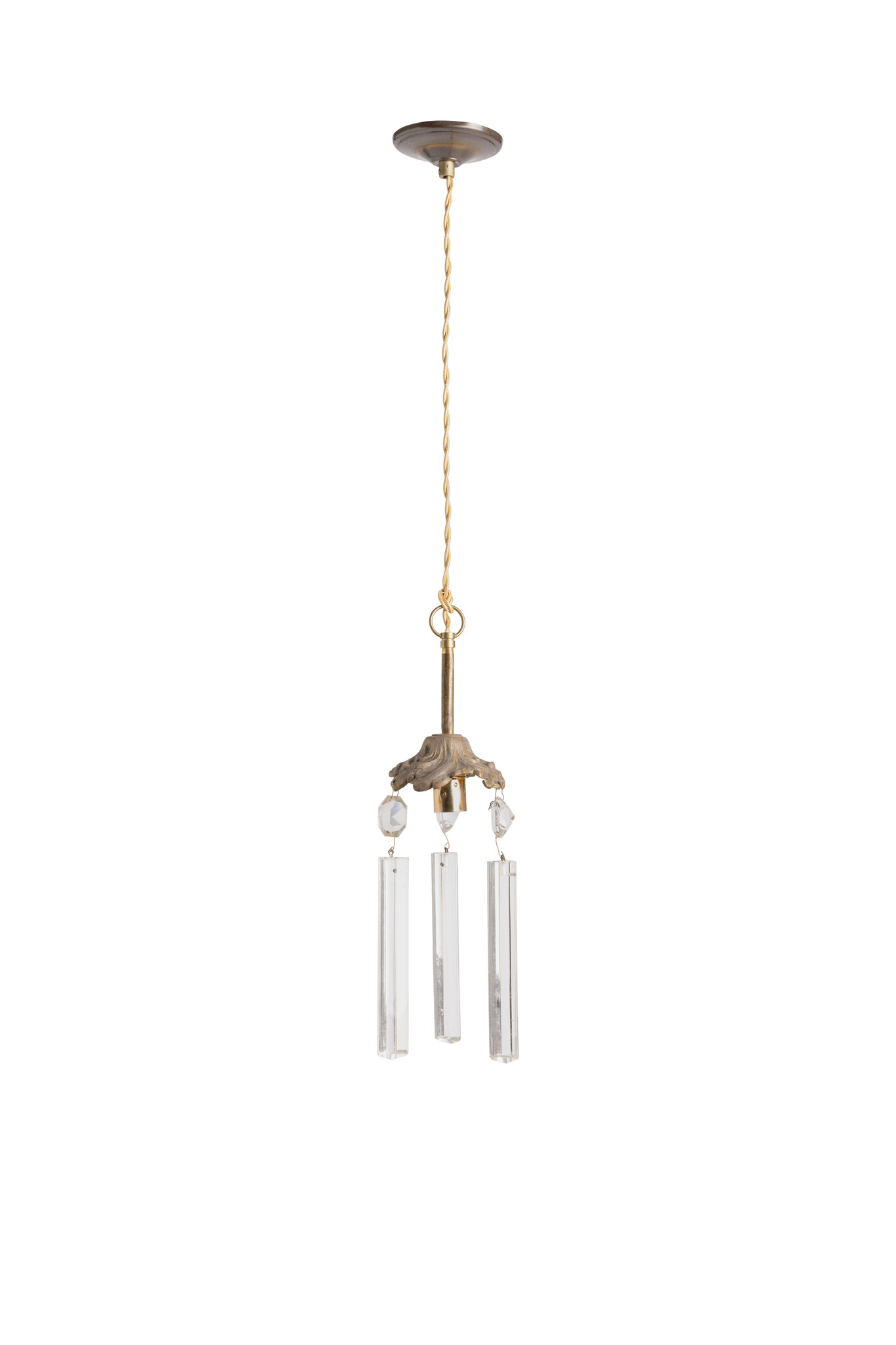 Boven de fitting een kleine koperen houder met glazen kralen.