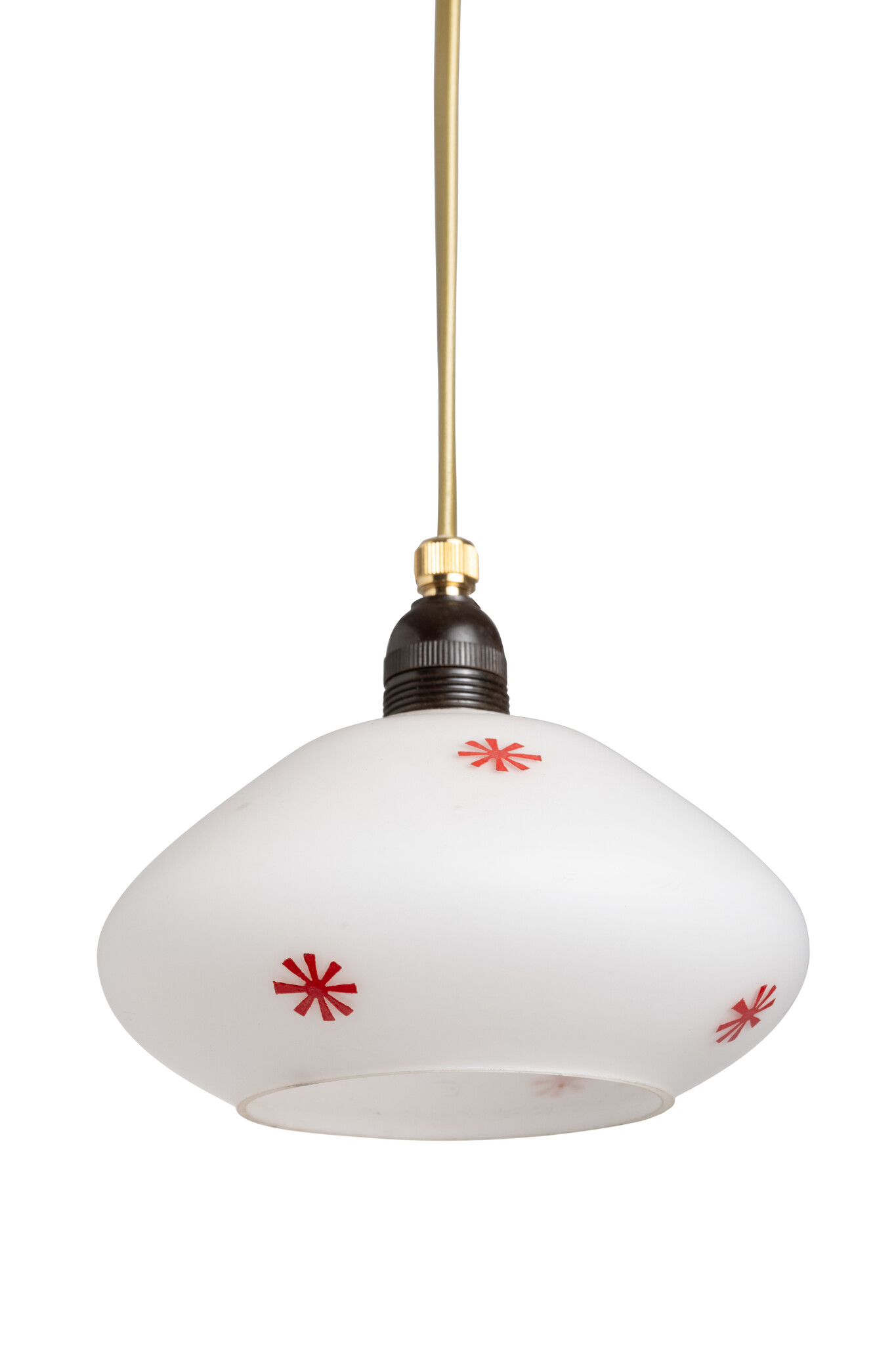 Een witte glazen lampenkap, met rode sterretjes.