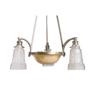 Albasten schaal met matglazen lampenkapjes in een verchroomd messing armatuur.