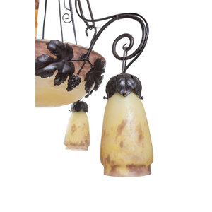 Een zwart smeedijzeren frame met een glazen middenschaal en 3 lampenkapjes aan de zijkant.