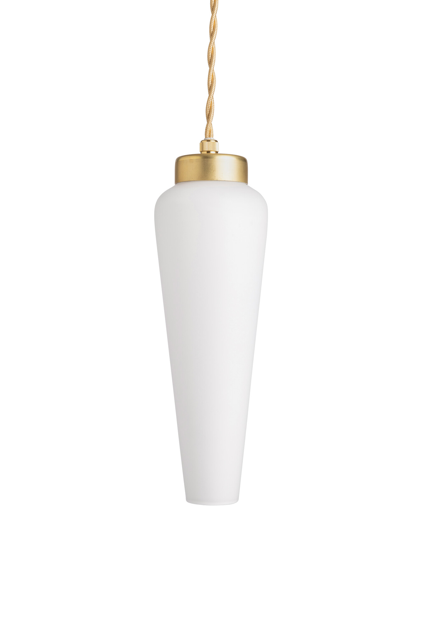 Een strak, minimalistisch lampje, wit glas en messing armatuur.