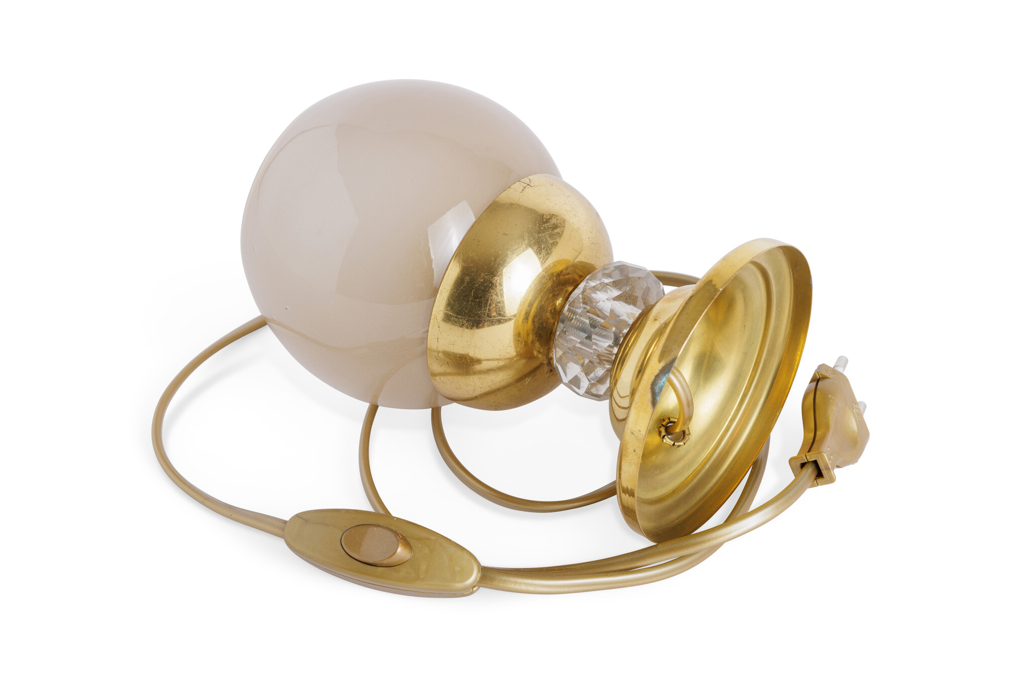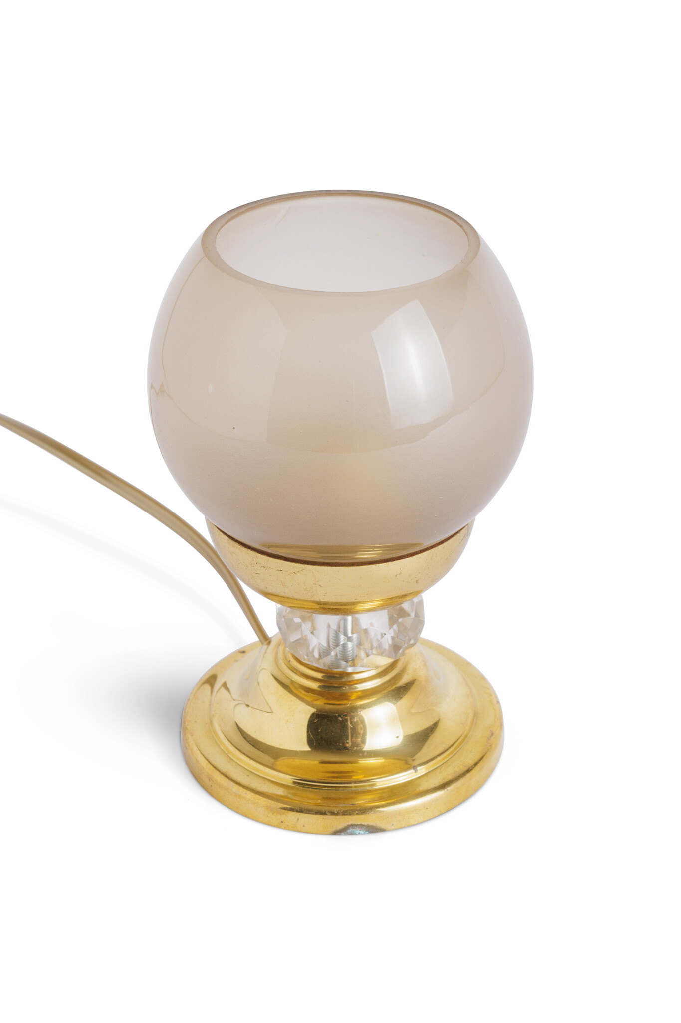 De goudkleurige voet heeft een opvallend detail: een grote, helder geslepen glazen kraal die als een juweel in het ontwerp is verwerkt.
