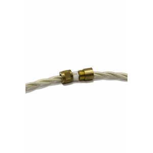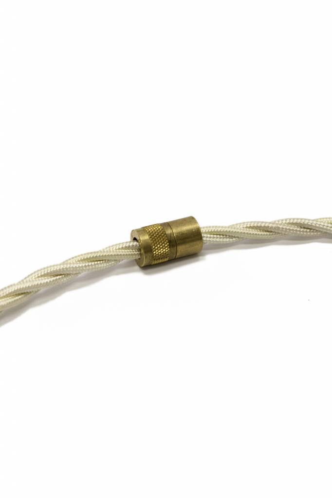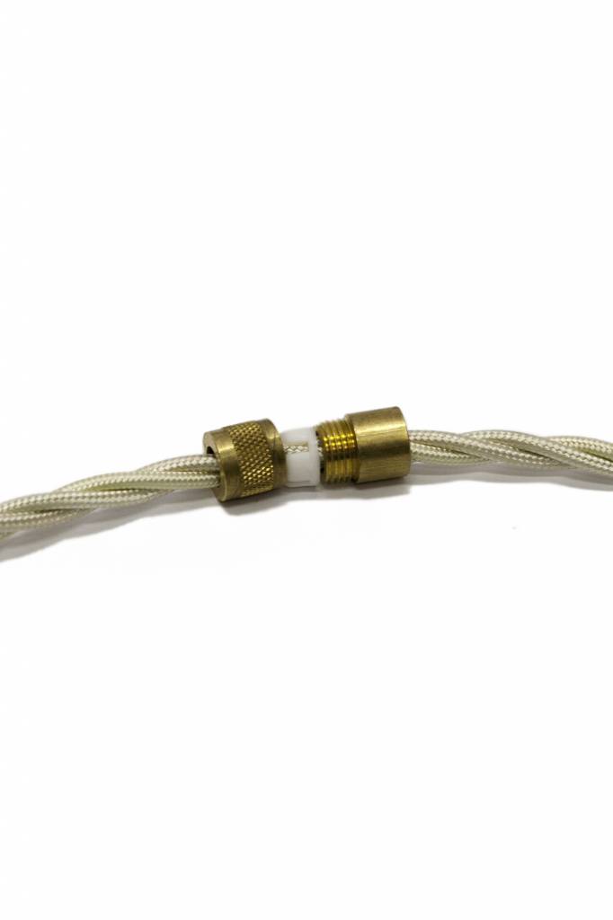 Door de 2 metalen delen aan te draaien, klem je het (witte) stukje plastic strak tegen het snoer aan.