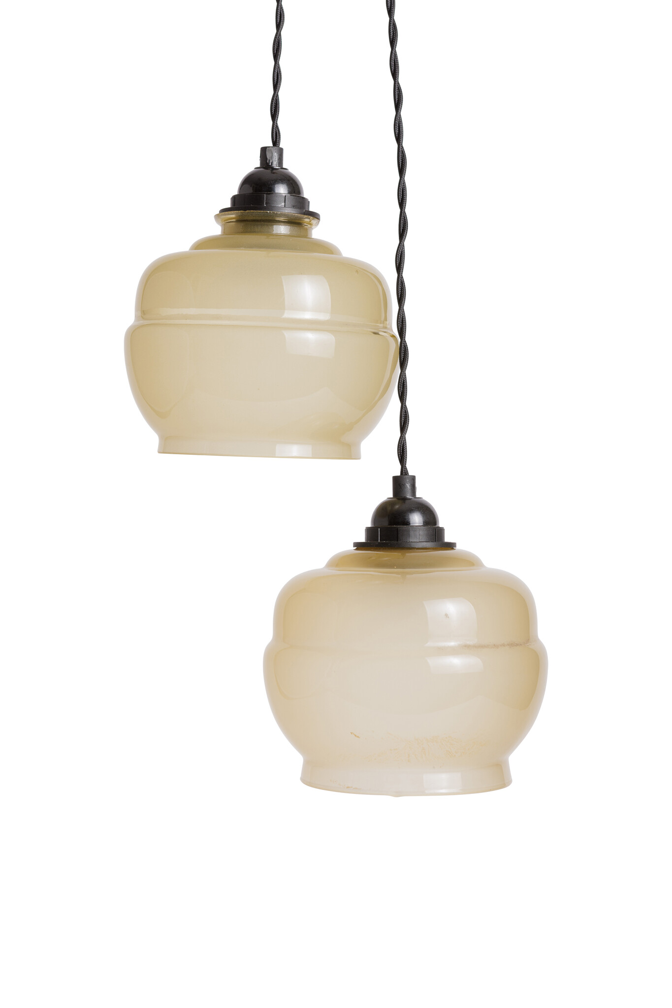 Aan het armatuur hangen twee net iets verschillende bruine glazen kappen.