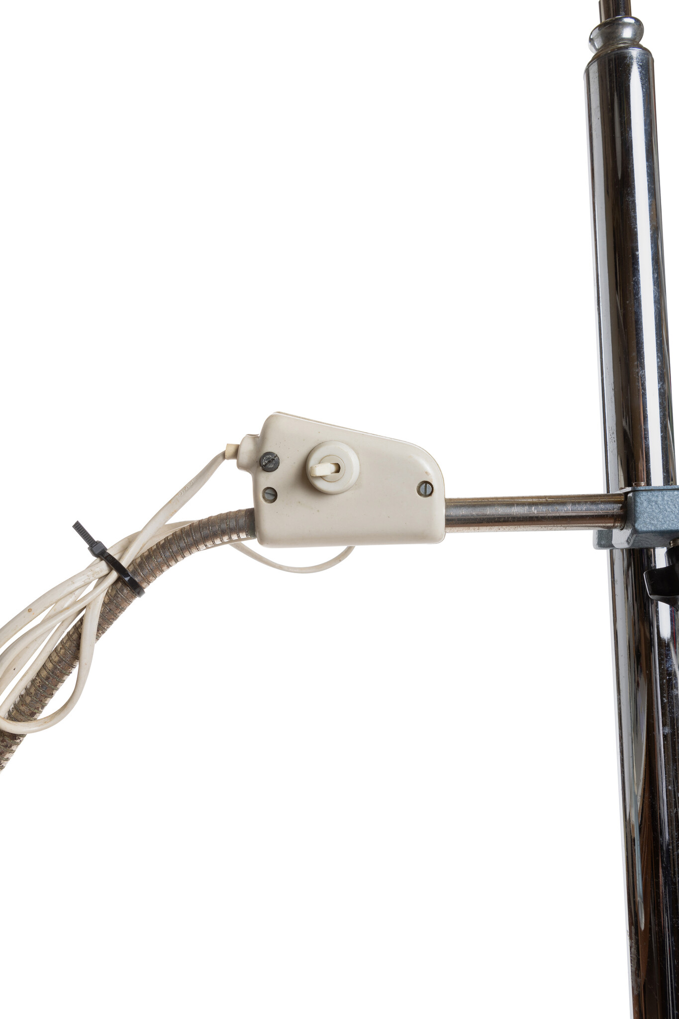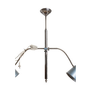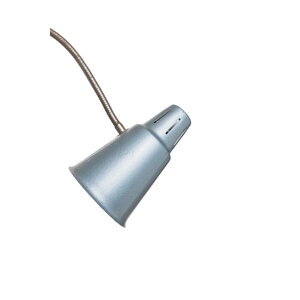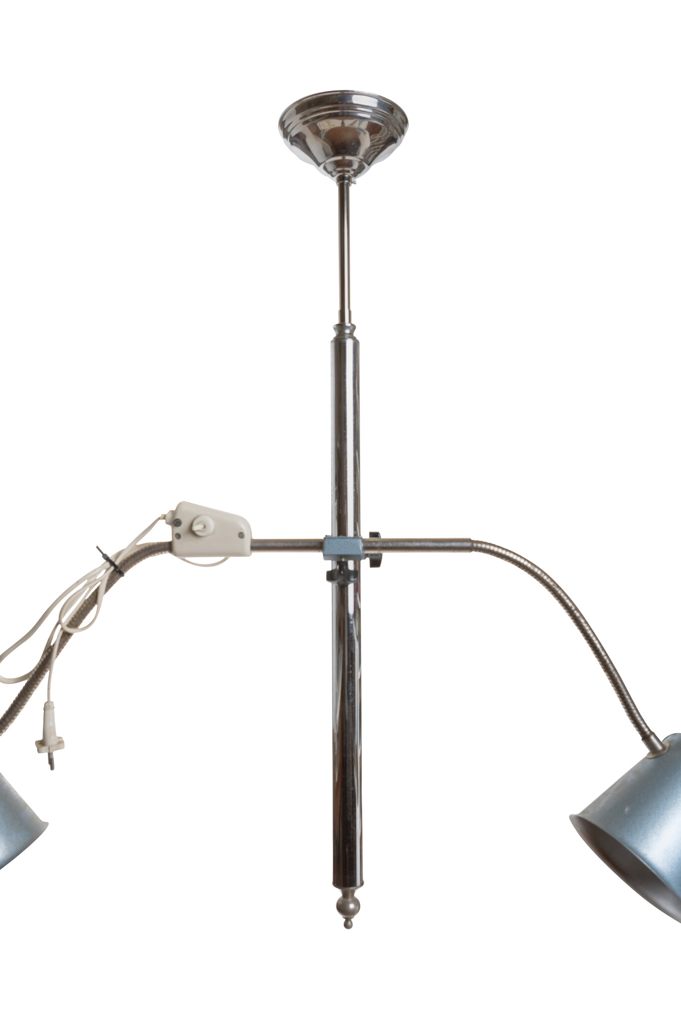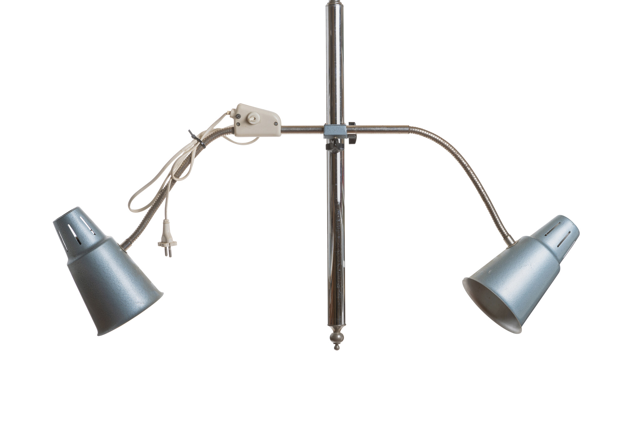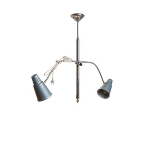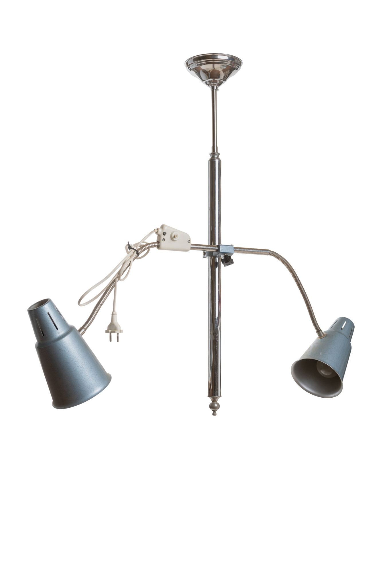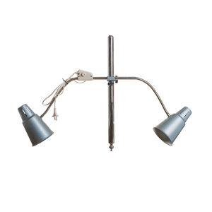 Een zilverkleurige stang met daaraan twee spots (blauw-grijs metallic kleurig).