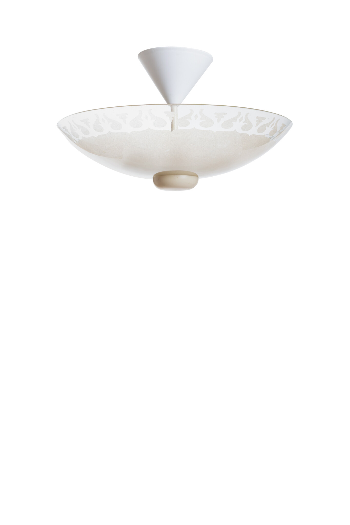 Een ronde glazen schaal, vrij dicht bij het plafond.