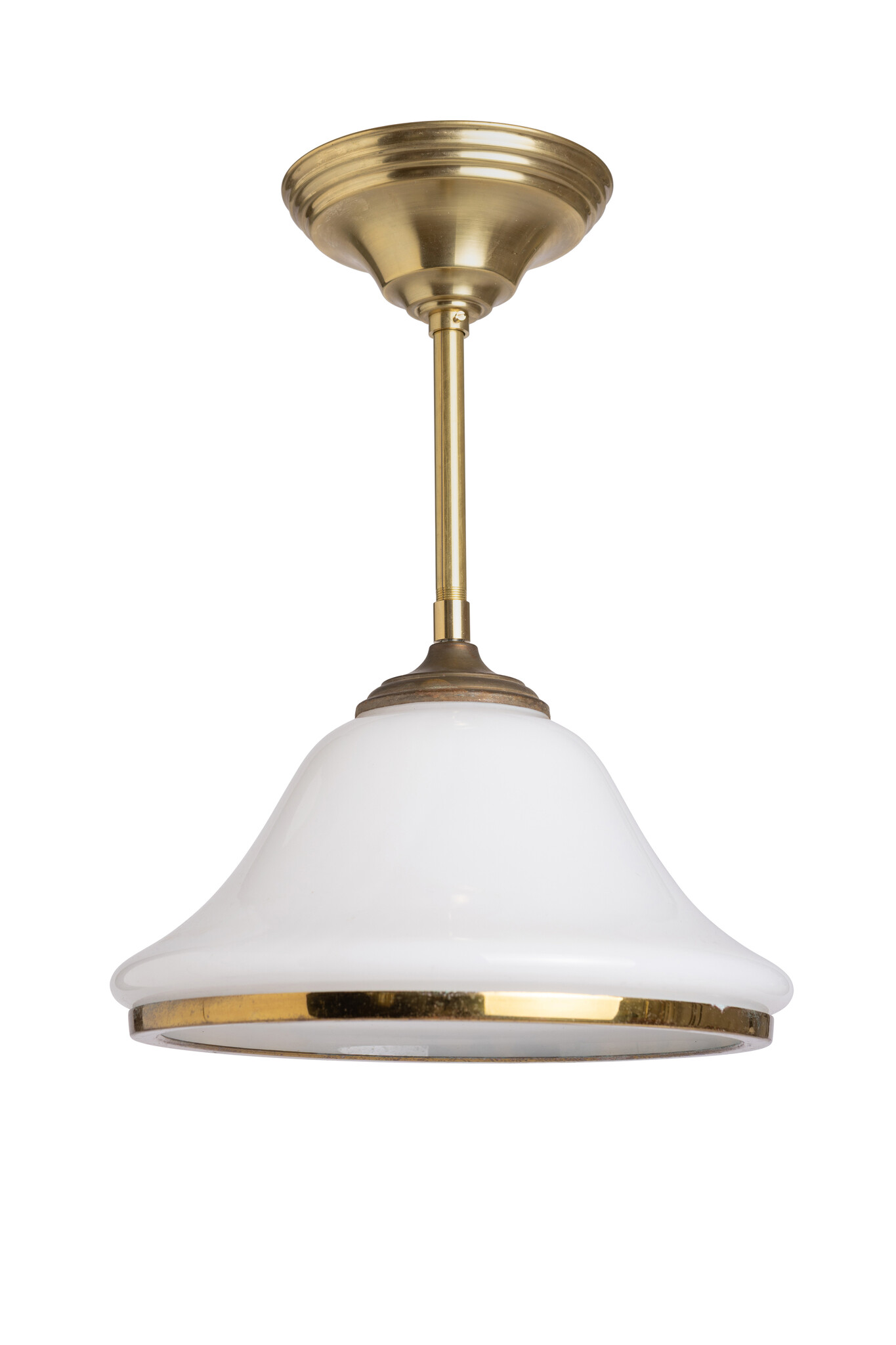 Een wit glazen lampenkap en een goudkleurig (messing) armatuur.