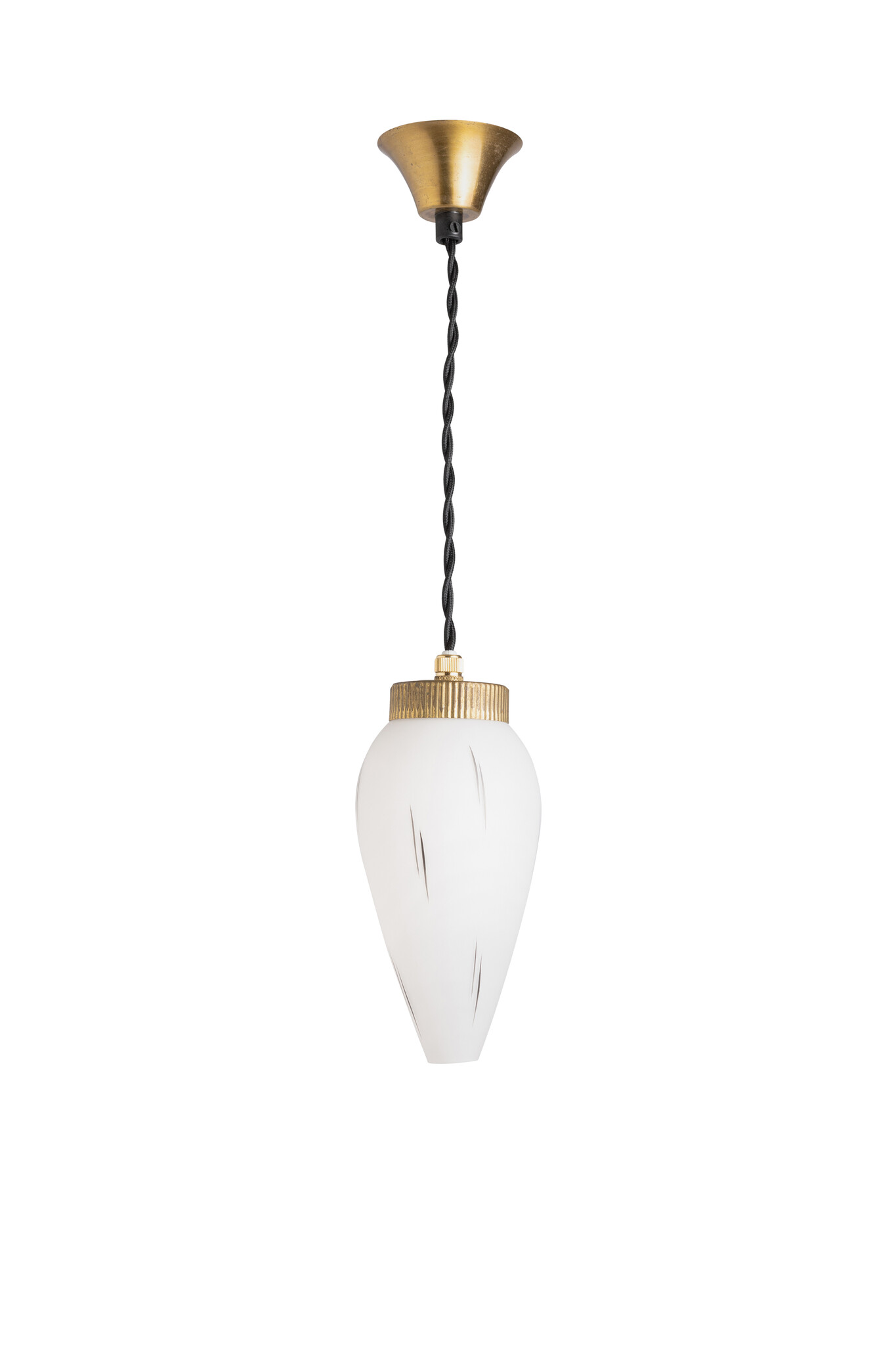 Glazen kapje hangt aan zwart gedraaid stoffen snoer.