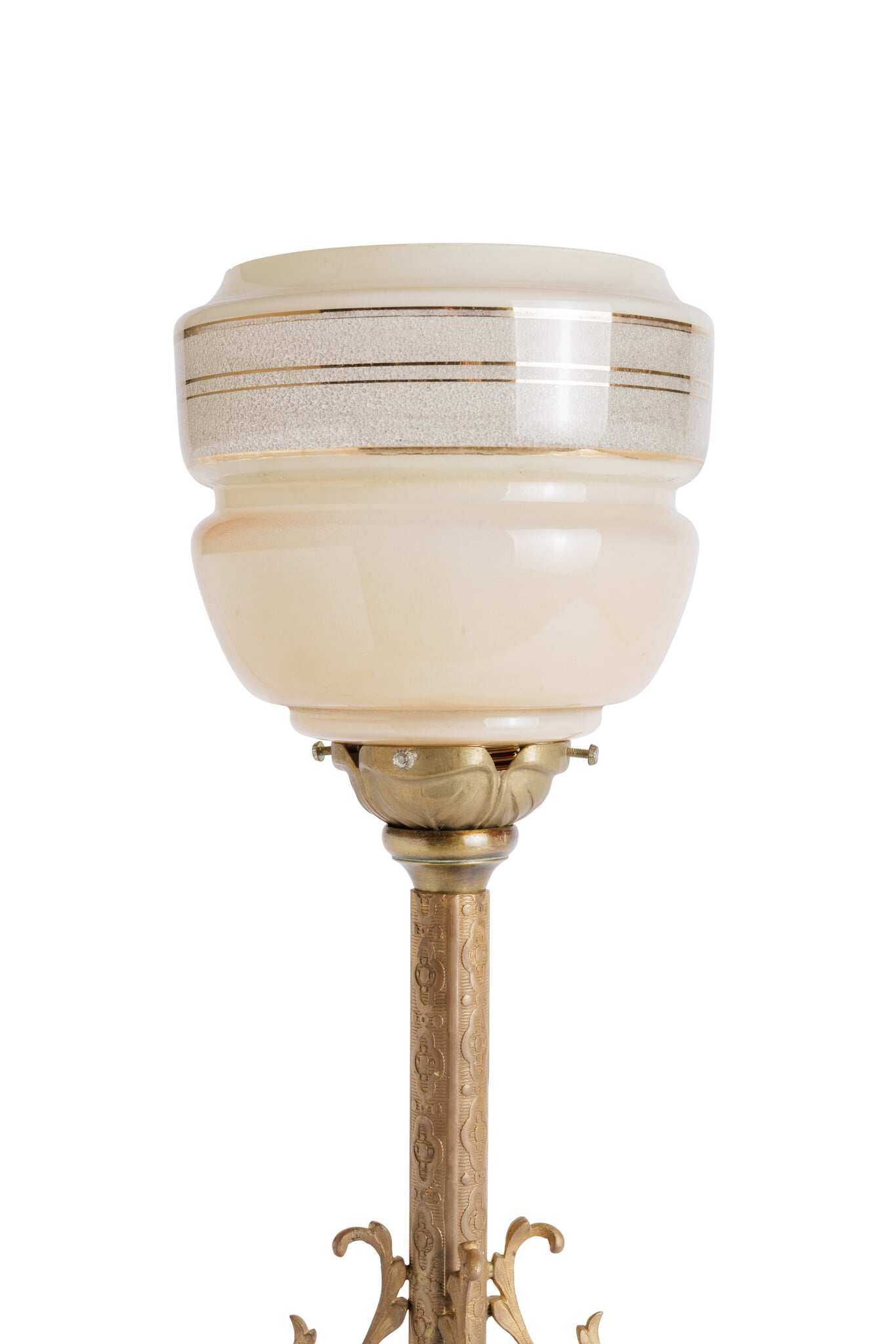 De kap van bruin glas is zo ontworpen dat het licht naar boven schijnt, wat voor een rustige sfeer in de kamer zorgt.