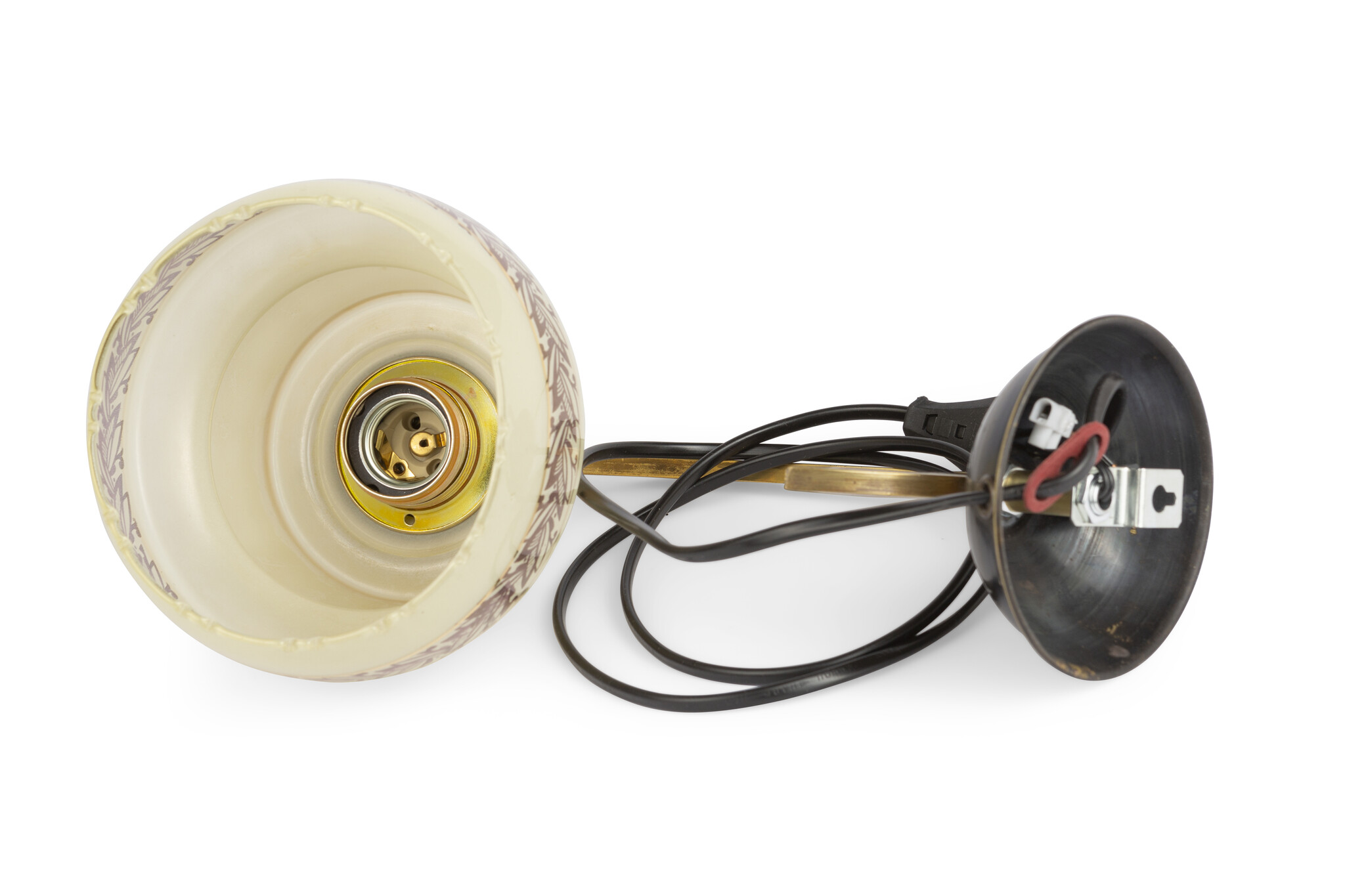 De licht gele glazen lampenkap is voorzien van goudkleurige biezen en heeft aan de onderzijde een klein ribbeltje.