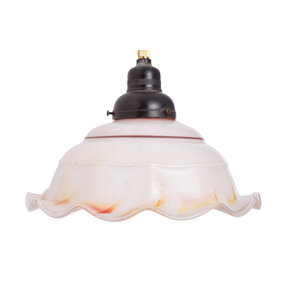Een wit glazen kapje met oranje-rode accenten, zie vooral de foto's hiervoor.