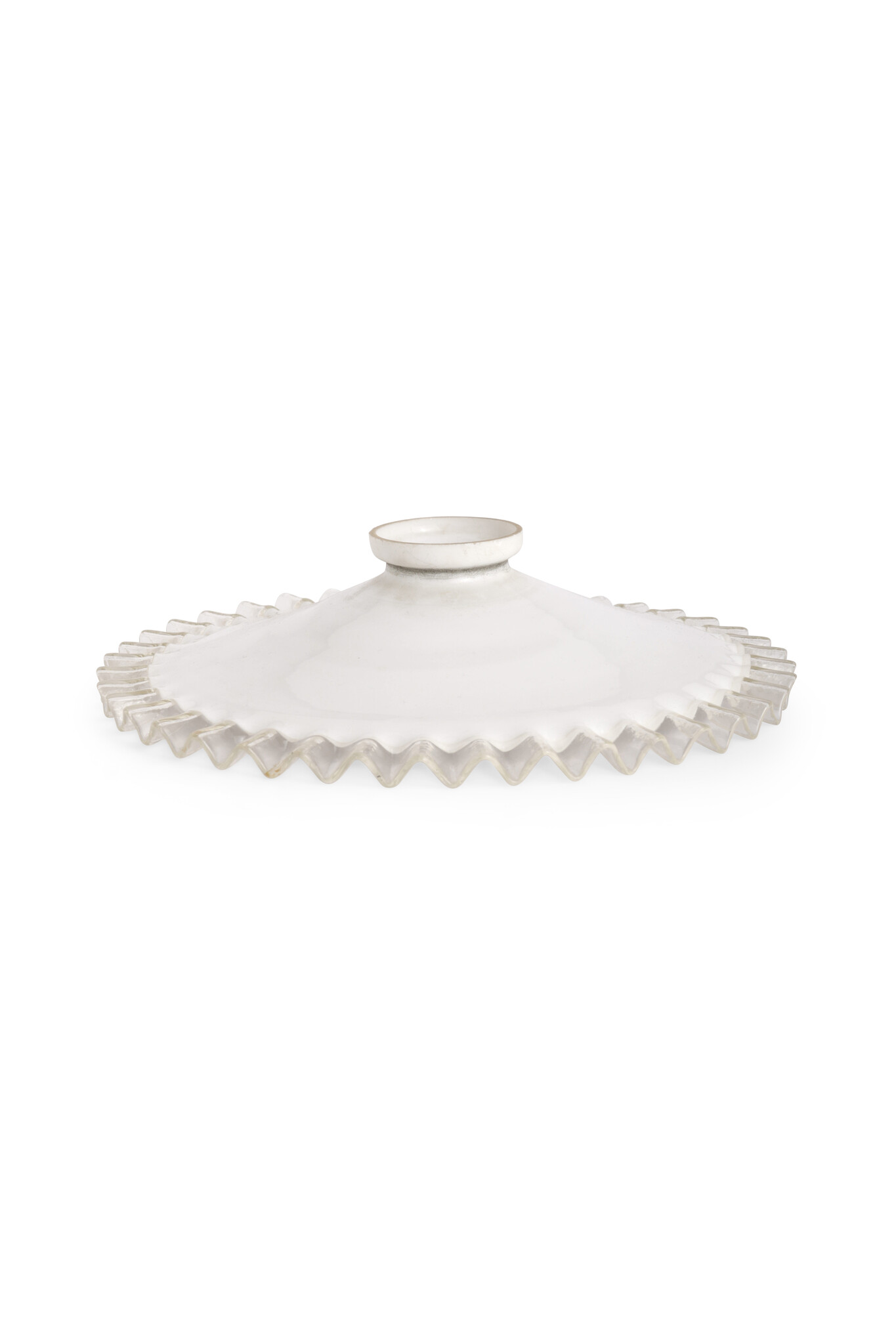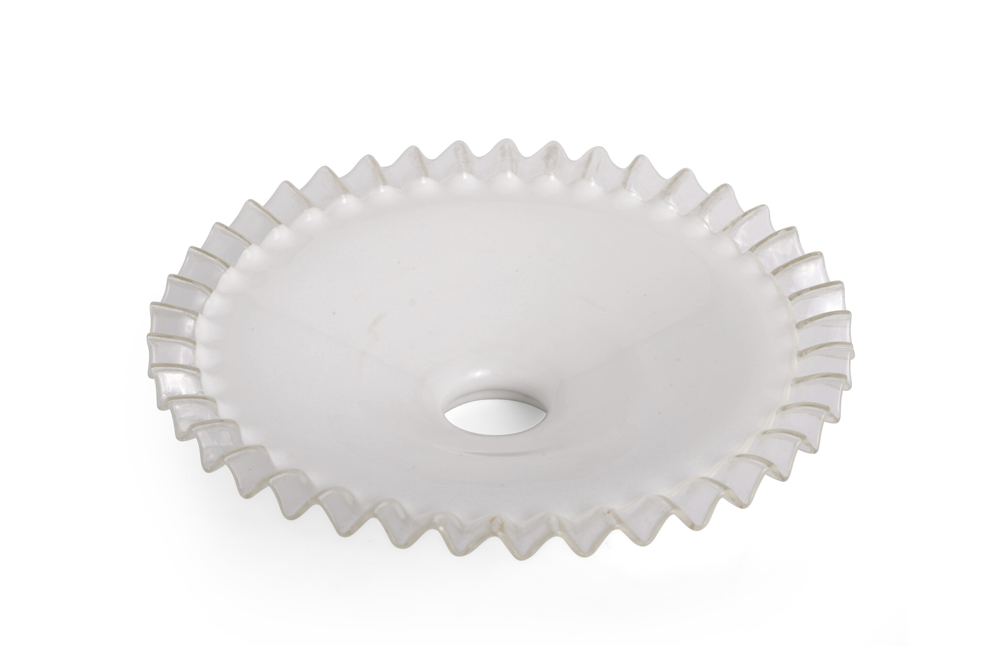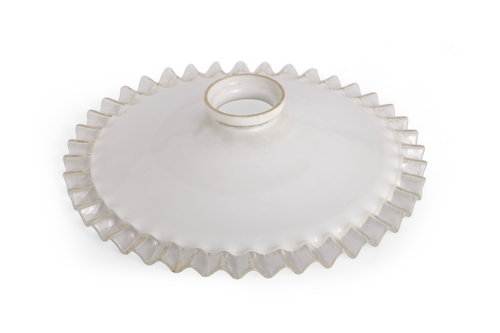 Wit glas met een helder glazen ribbelrand aan de buitenzijde.