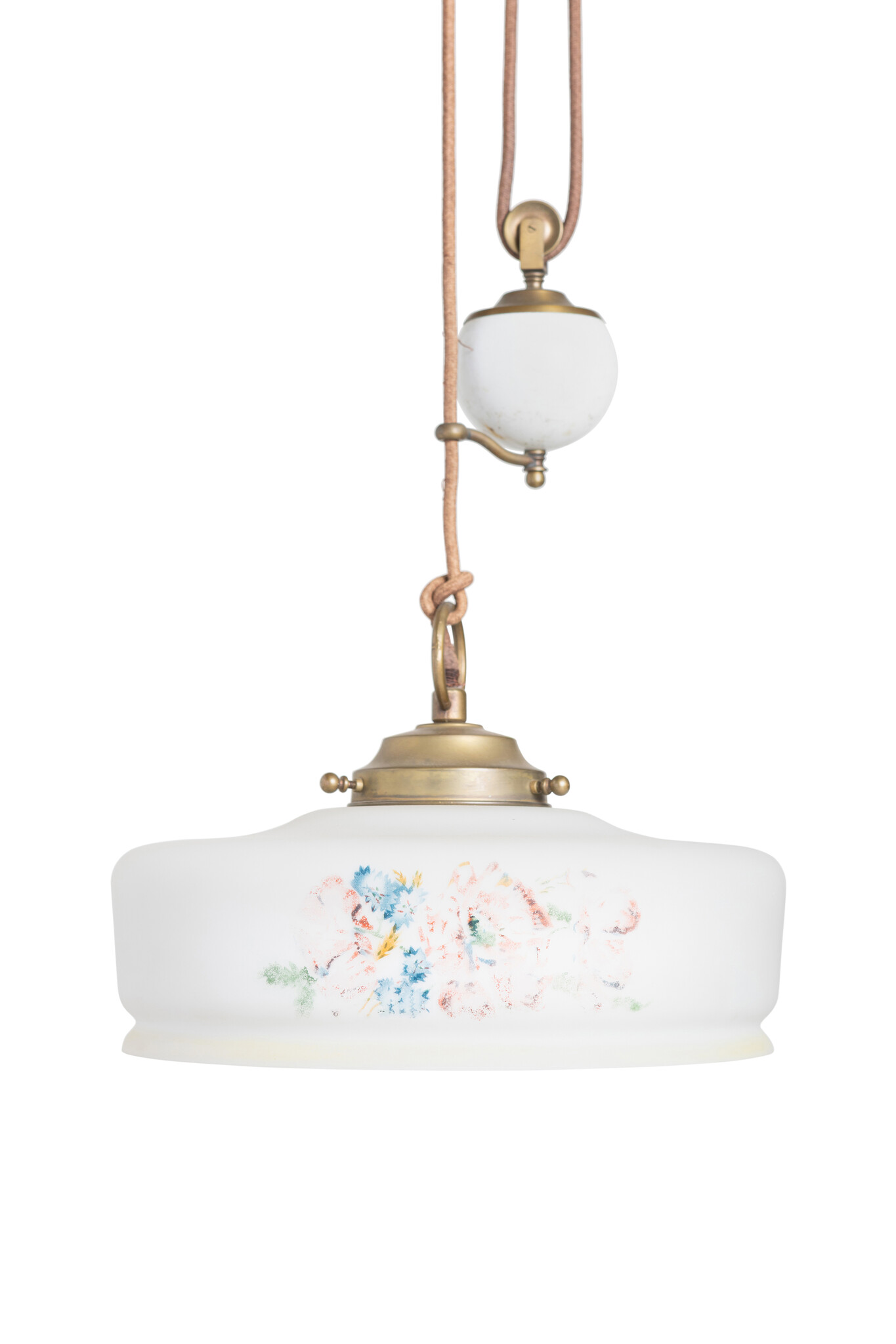 Een wit glazen lampenkap, met een porseleinen trekpendel.
